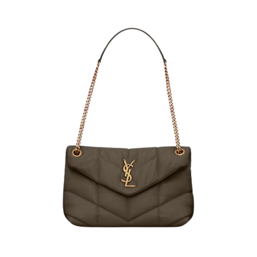Borsa Saint Laurent Loulou Puffer Small in nappa verde oliva 29 cm