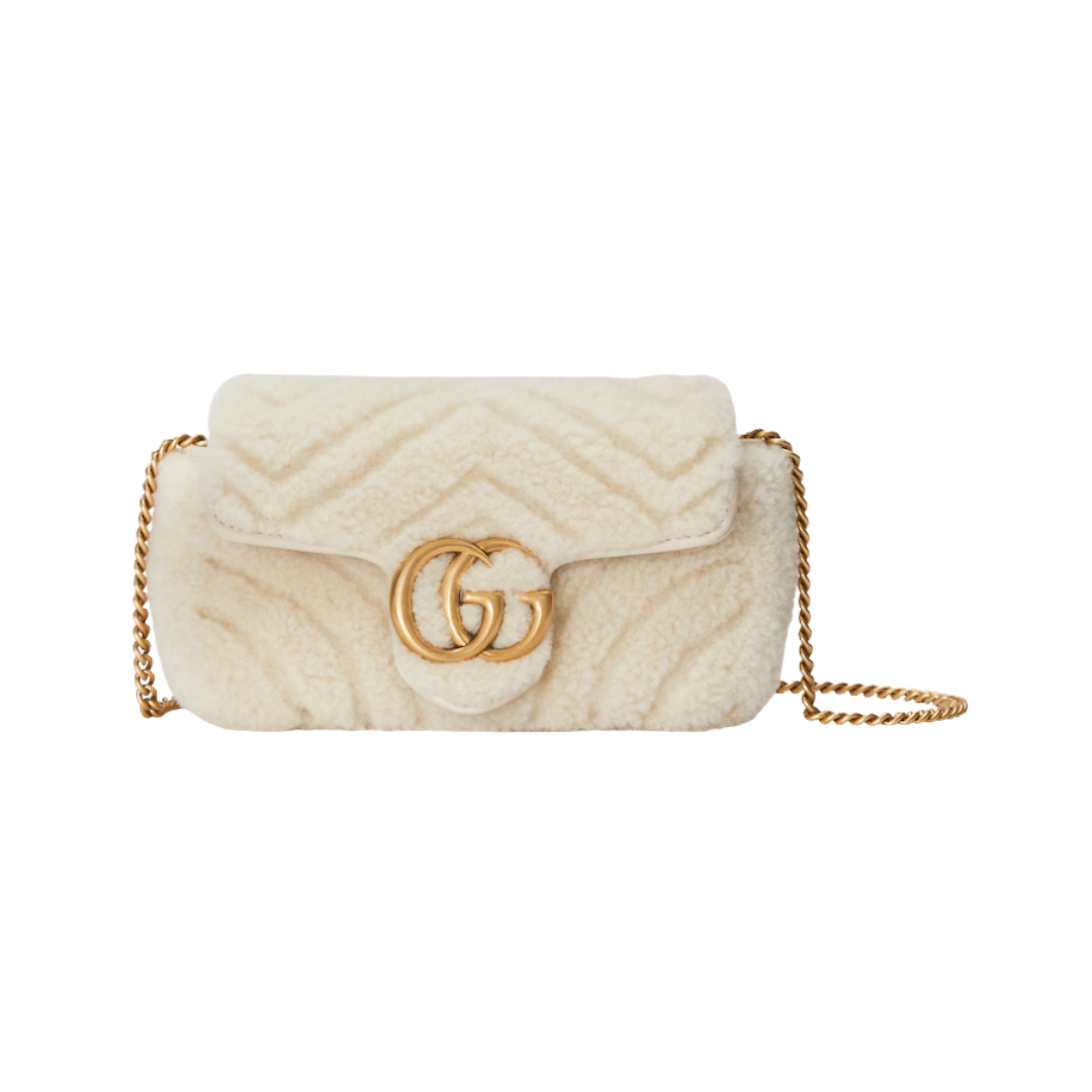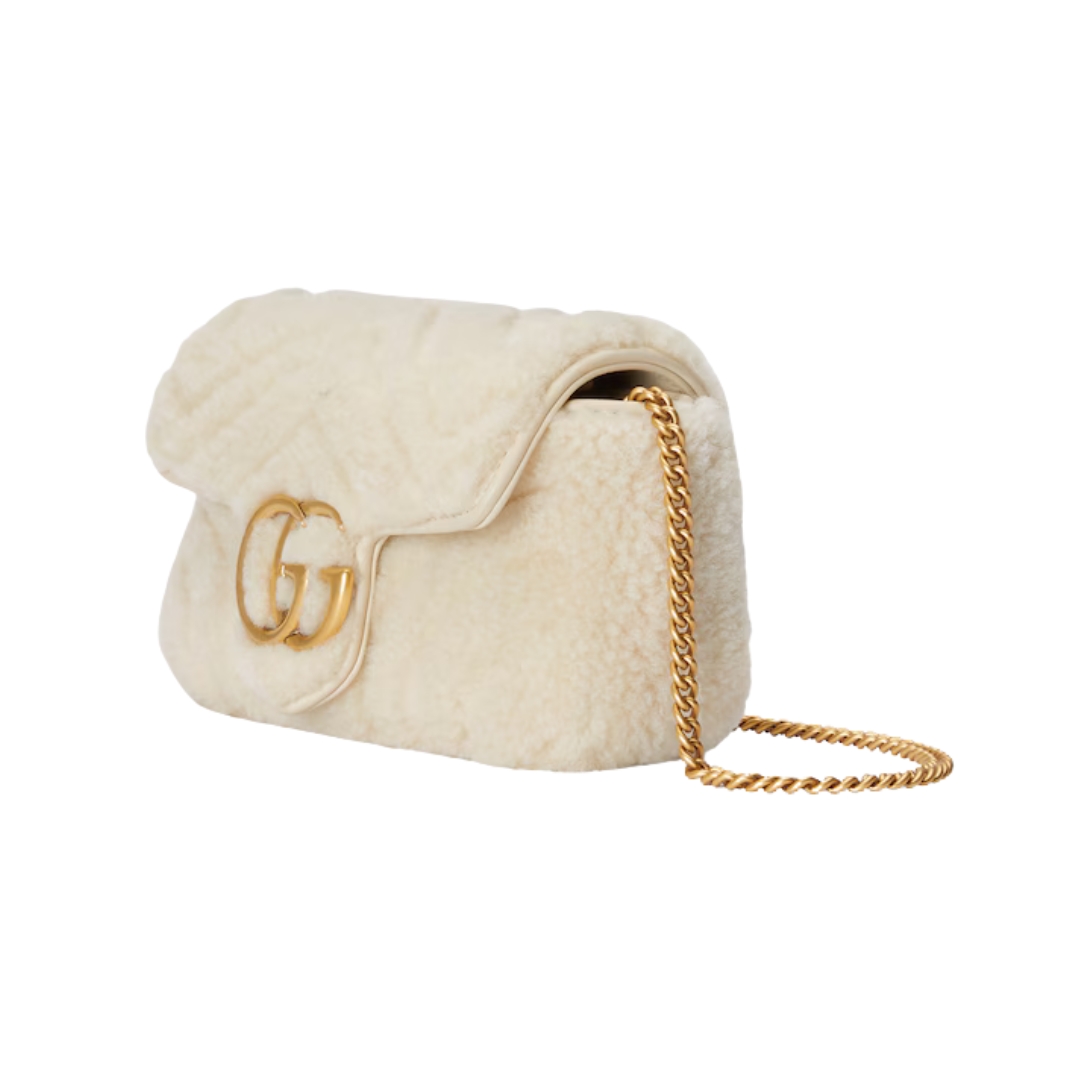Borsa a spalla Gucci GG Marmont Super Mini in shearling color crema 16.5 cm