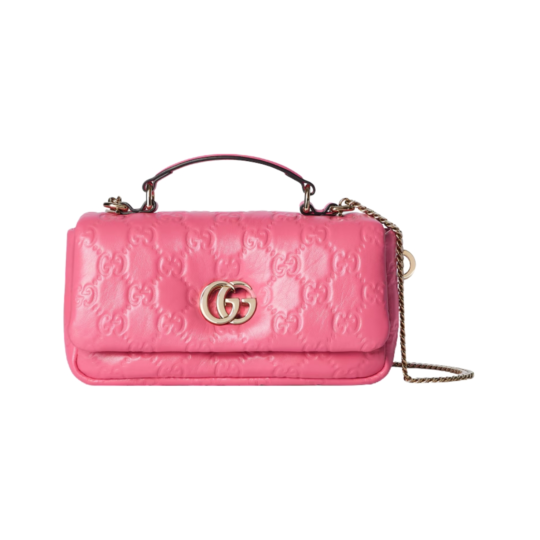 Dimensioni:● Larghezza: 21.1 cm● Altezza: 13 cm● Profondità: 6 cm Dettagli:● Materiale: Pelle trapuntata GG● Colore: Fucsia● Chiusura: Zip superiore●