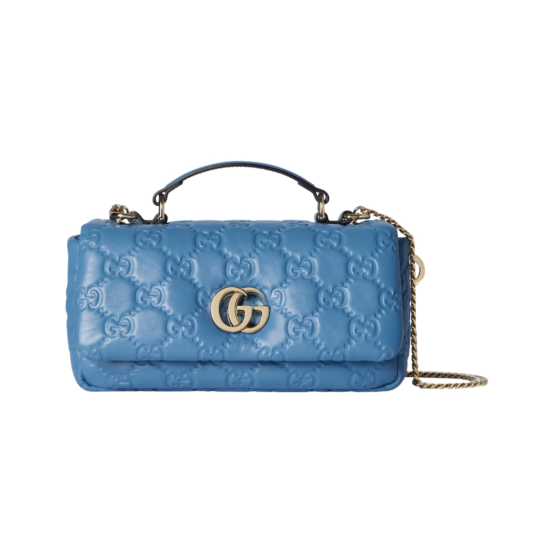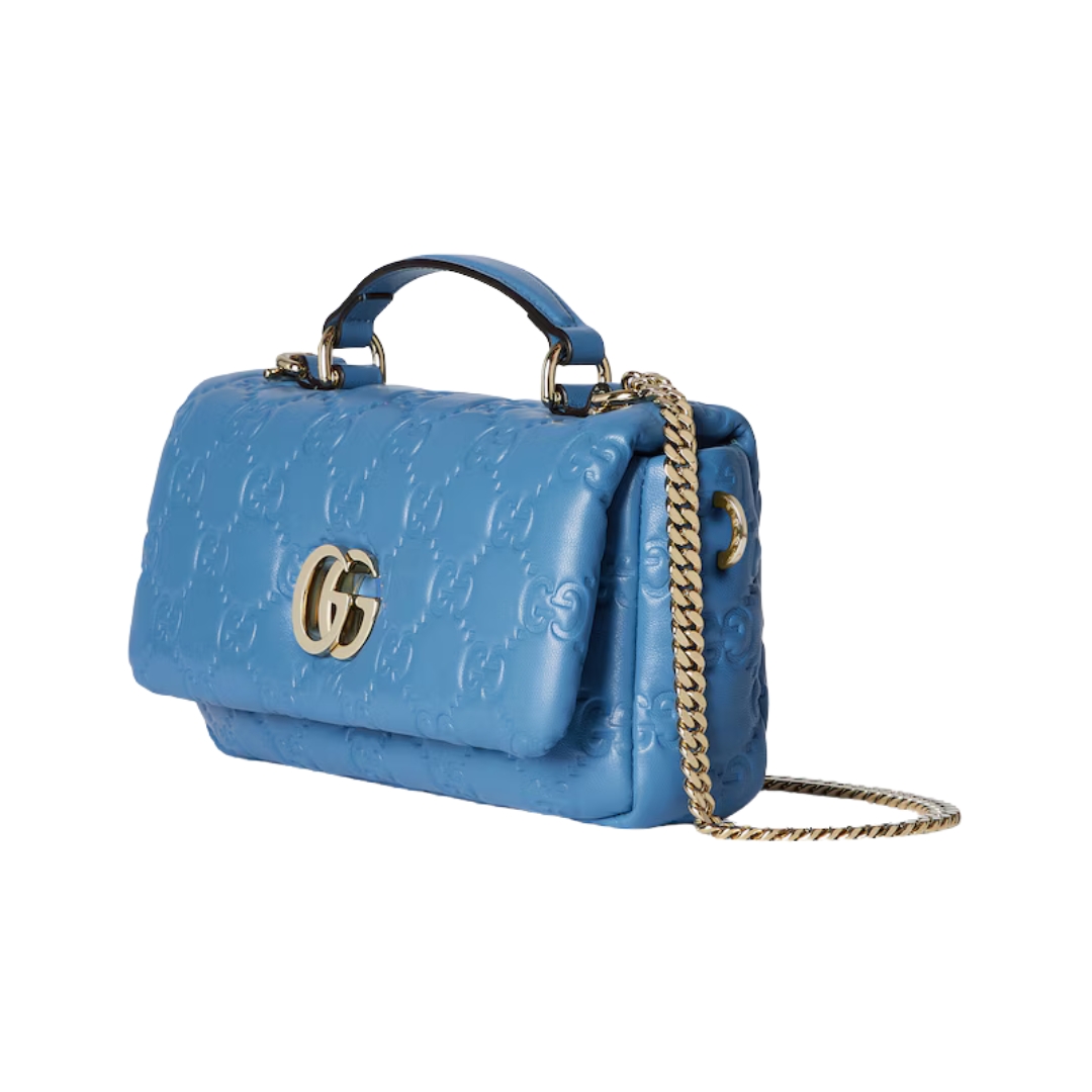 Dimensioni:● Larghezza: 21.1 cm● Altezza: 13 cm● Profondità: 6 cm Dettagli:● Materiale: Pelle trapuntata GG● Colore: Azzurro● Chiusura: Zip superiore●