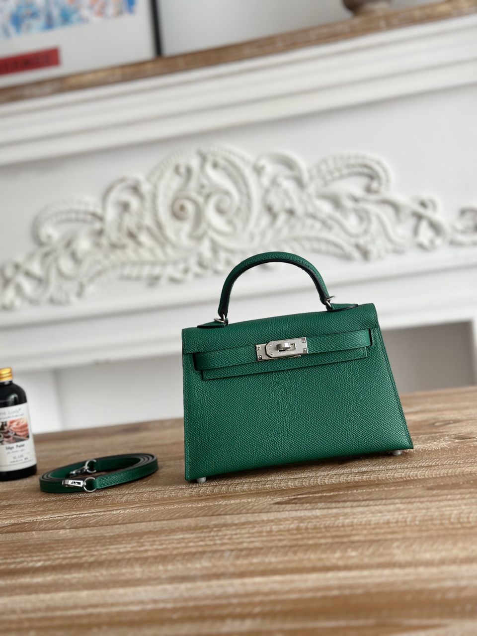 Borsa Hermès Kelly Mini in pelle Epsom verde smeraldo con finiture argento
