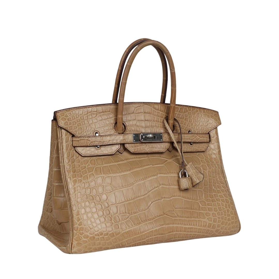 Borsa Hermès Birkin 35 in alligatore opaco Poussière con finiture palladio