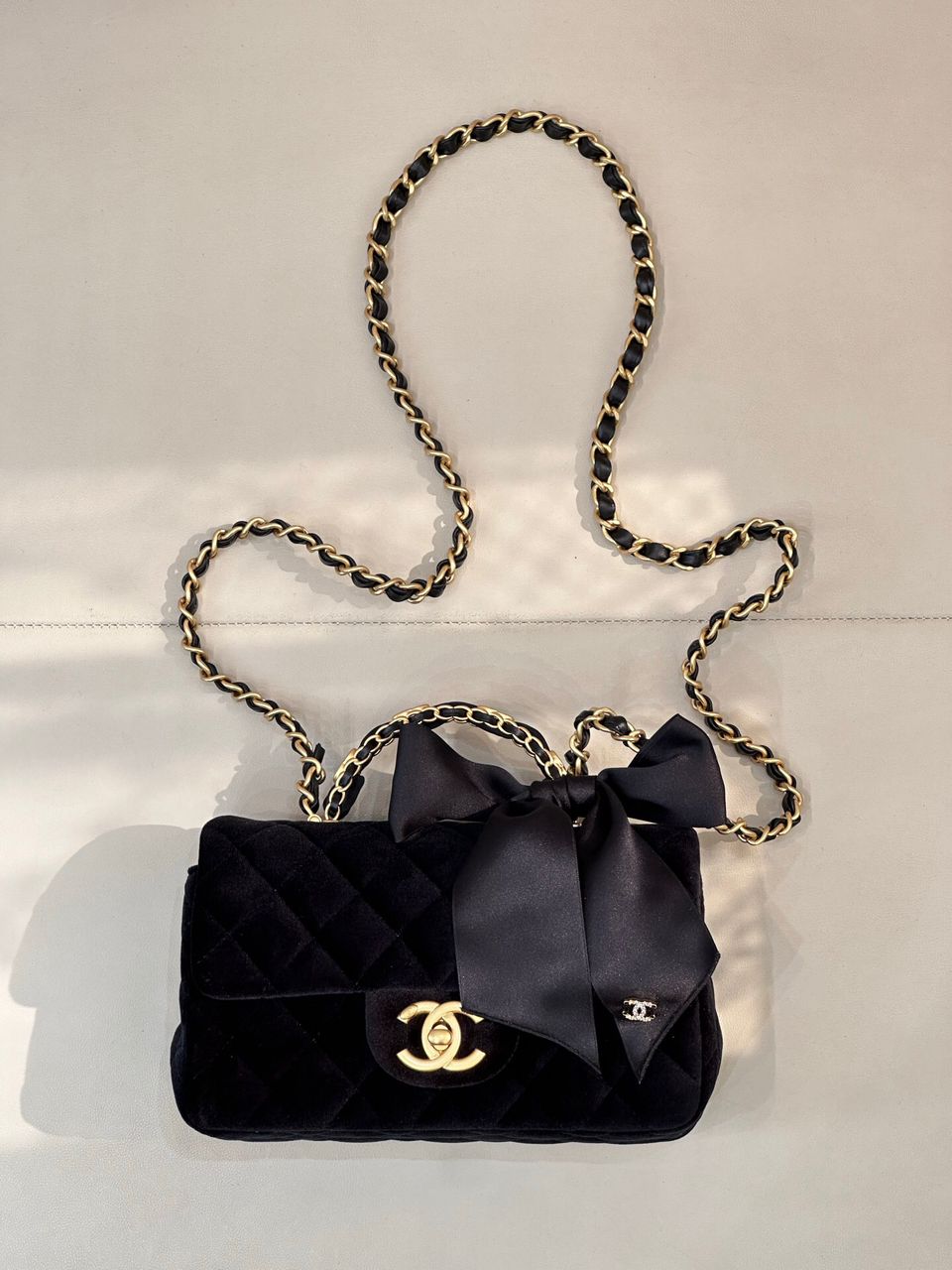 Borsa Chanel in velluto nero trapuntato con tracolla a catena