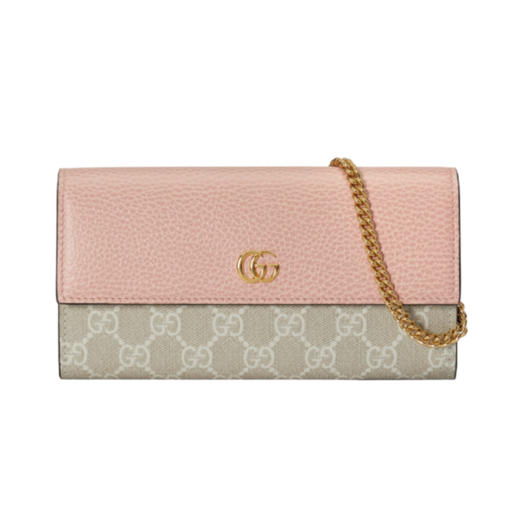 Dimensioni:● Larghezza: 19 cm● Altezza: 10 cm● Profondità: 4 cm Dettagli:● Materiale: Pelle rosa e tela GG Supreme● Colore: Rosa