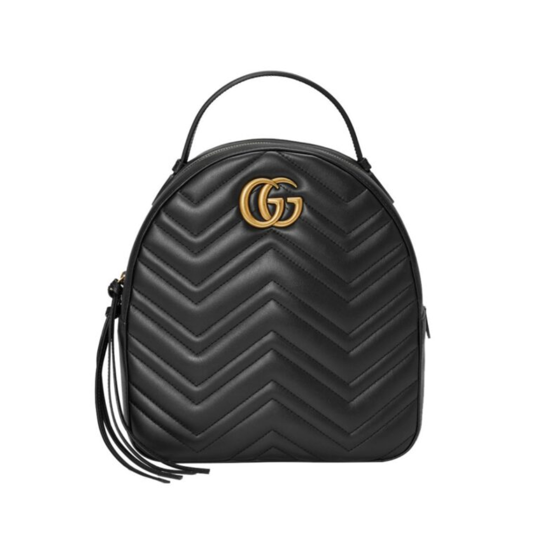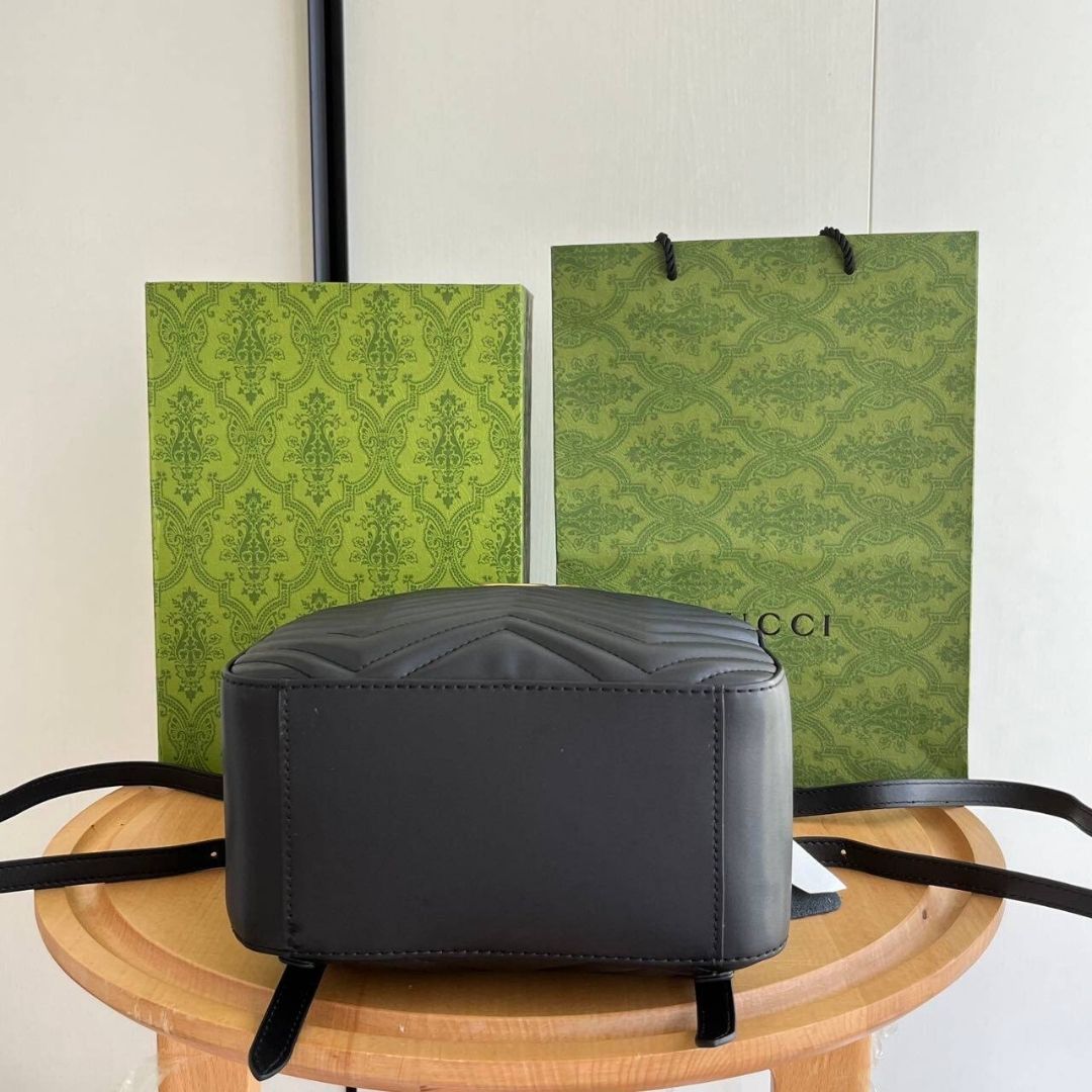 Dimensioni:● Larghezza: 23 cm● Altezza: 27 cm● Profondità: 10 cm Dettagli:● Materiale: Pelle matelassé● Colore: Nero● Chiusura: Zip● Logo: GG