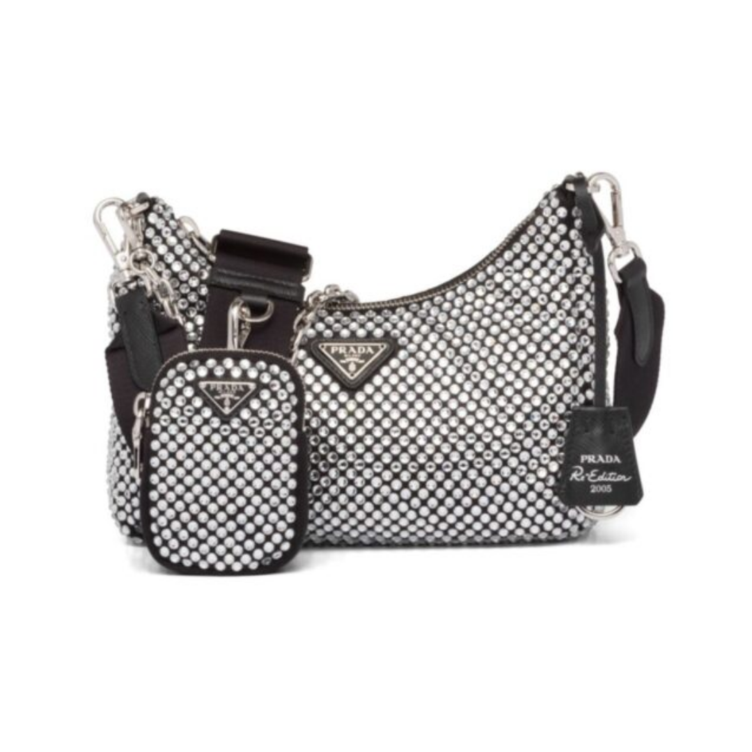 Borsa Prada Re-Edition 2005 con cristalli nera 22 cm
