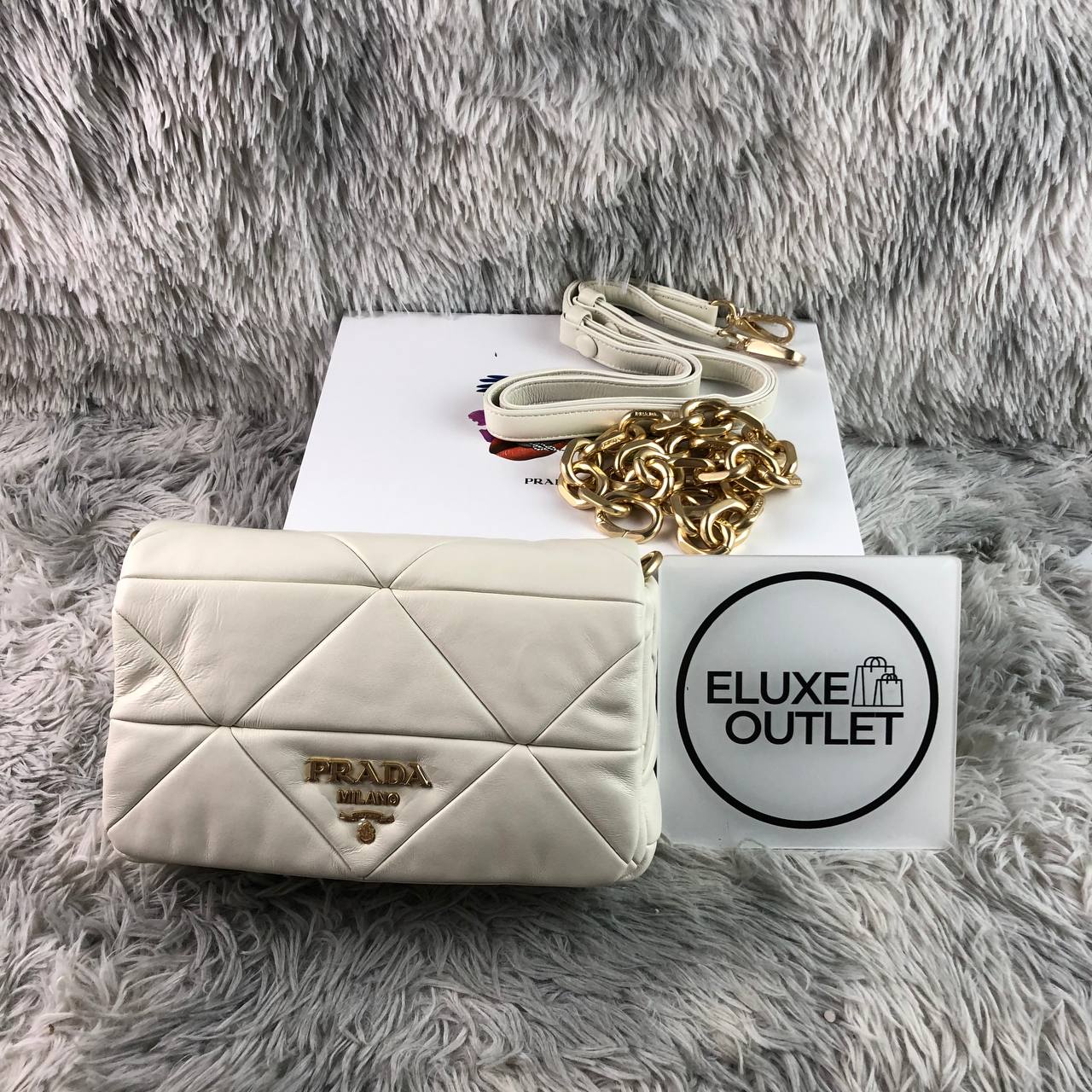 Dimensioni:● Larghezza: 24 cm● Altezza: 16 cm● Profondità: 9 cm Dettagli:● Materiale: Nappa trapuntata● Colore: Bianco● Chiusura: Patta con bottone