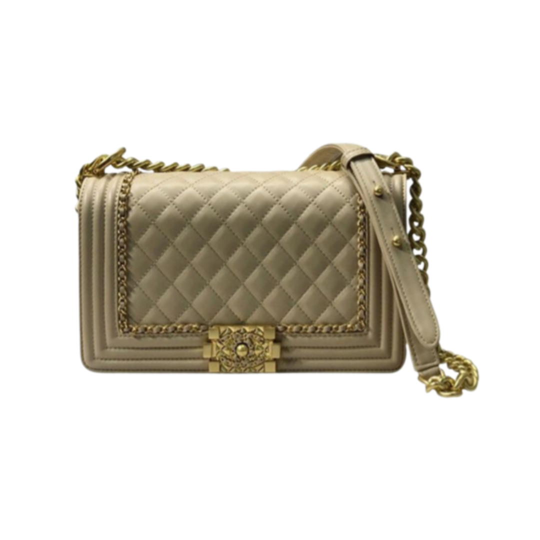Borsa Chanel Boy in pelle beige con catena dorata 25 cm