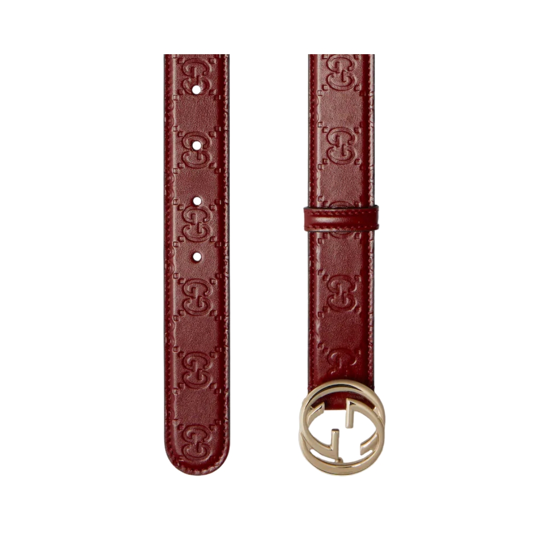 Dettagli:● Materiale: Pelle● Colore: Rosso ciliegia● Chiusura: Fibbia GG● Logo: GG dorato intrecciato● Altezza cintura: 2 cm● Parti metalliche: Dorate