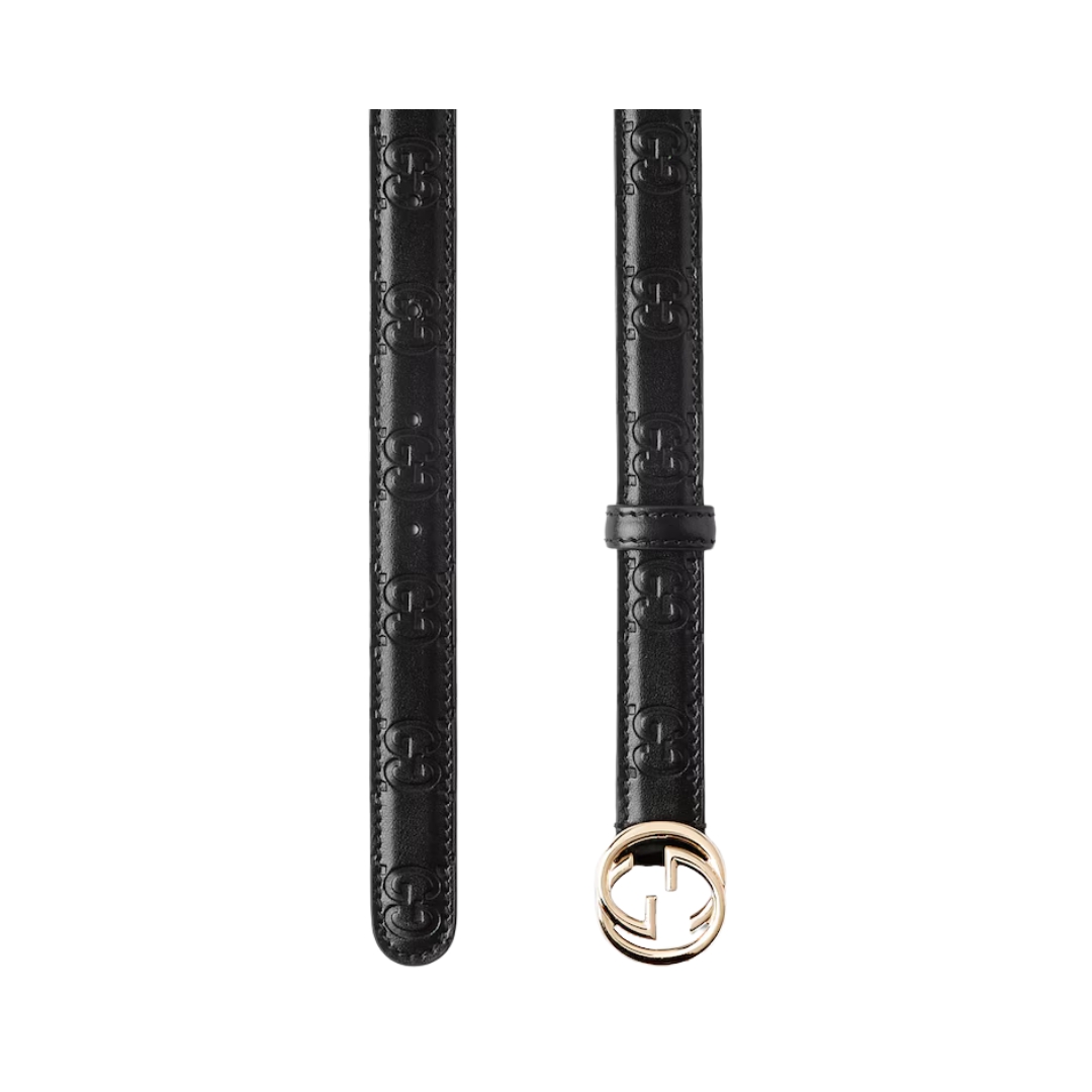 Dimensioni:● Altezza cintura: 3 cm Dettagli:● Materiale: pelle liscia● Colore: nero● Chiusura: fibbia G intrecciata dorata● Logo: G intrecciata frontale●