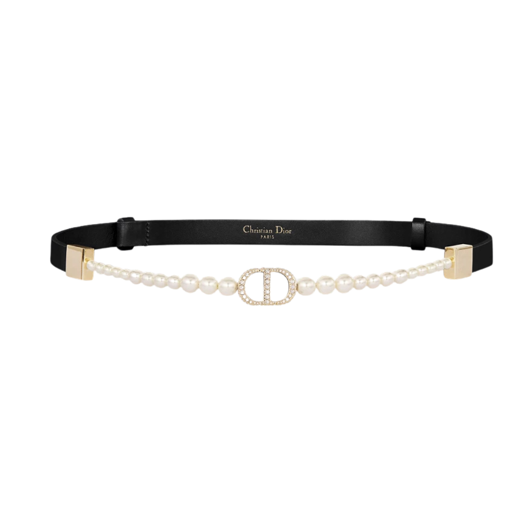 Cintura Dior 30 Montaigne in pelle nera con perle 1,5 cm