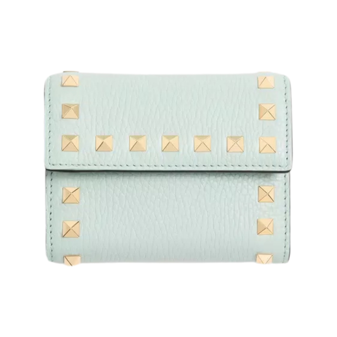 Portafoglio Valentino Rockstud trifold in pelle grigio cielo 11 cm