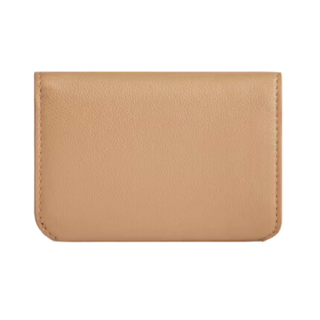 Dimensioni:● Larghezza: 10 cm● Altezza: 7 cm● Profondità: 2 cm Dettagli:● Materiale: Pelle di vitello● Colore: Latte● Chiusura: Bottone automatico●