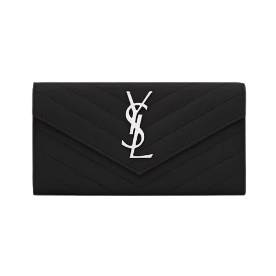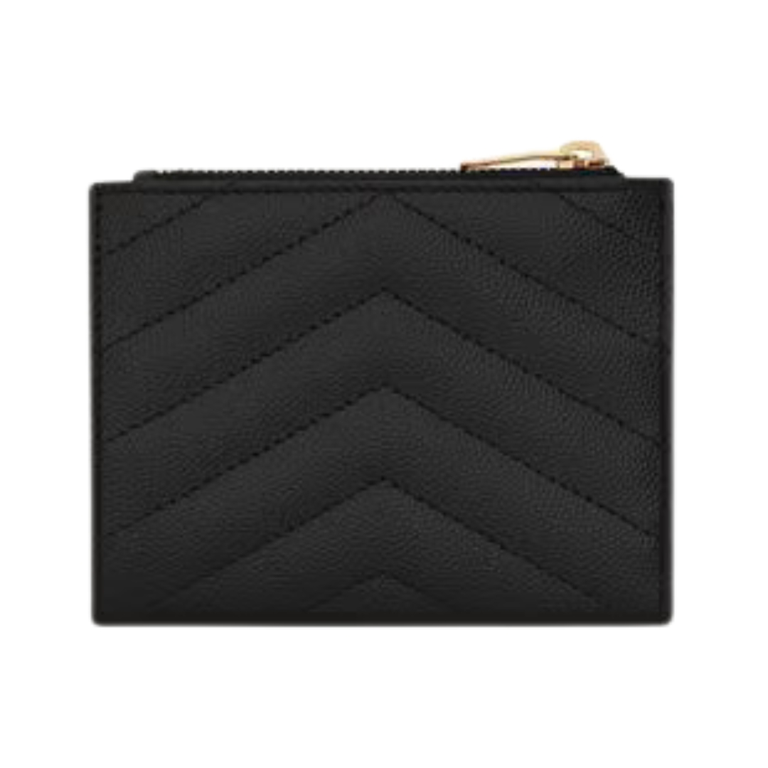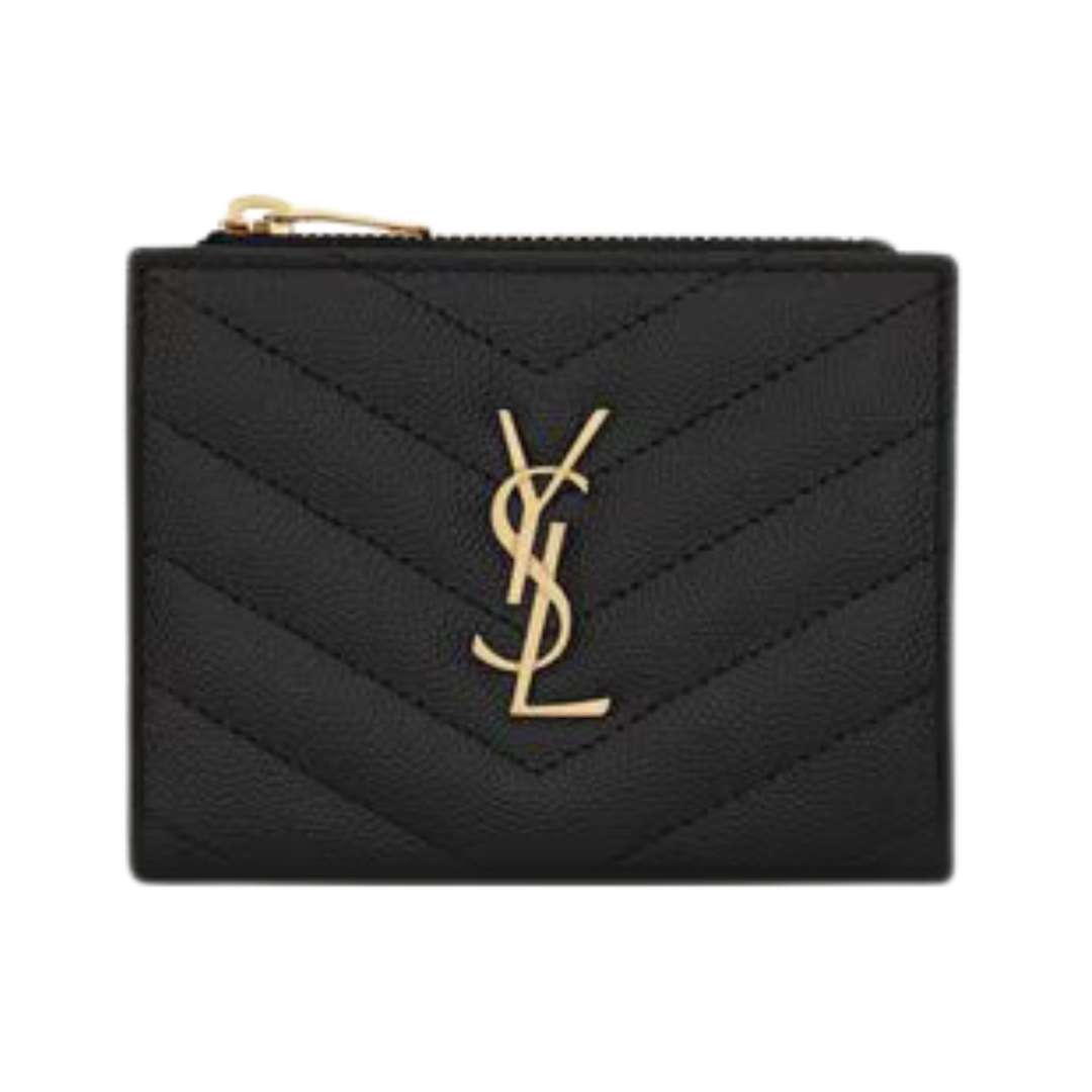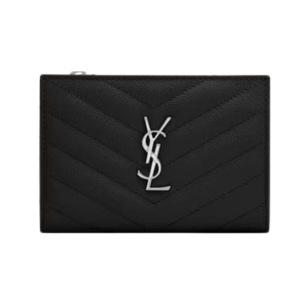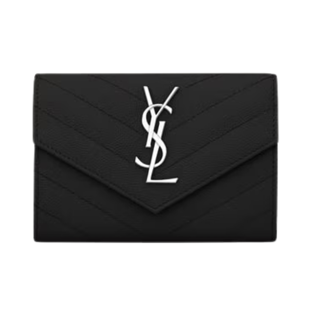 Dettagli:● Materiale: Pelle grain de poudre matelassé● Colore: Nero● Chiusura: Bottone a pressione● Logo: Monogram YSL dorato● Interno: Slot per
