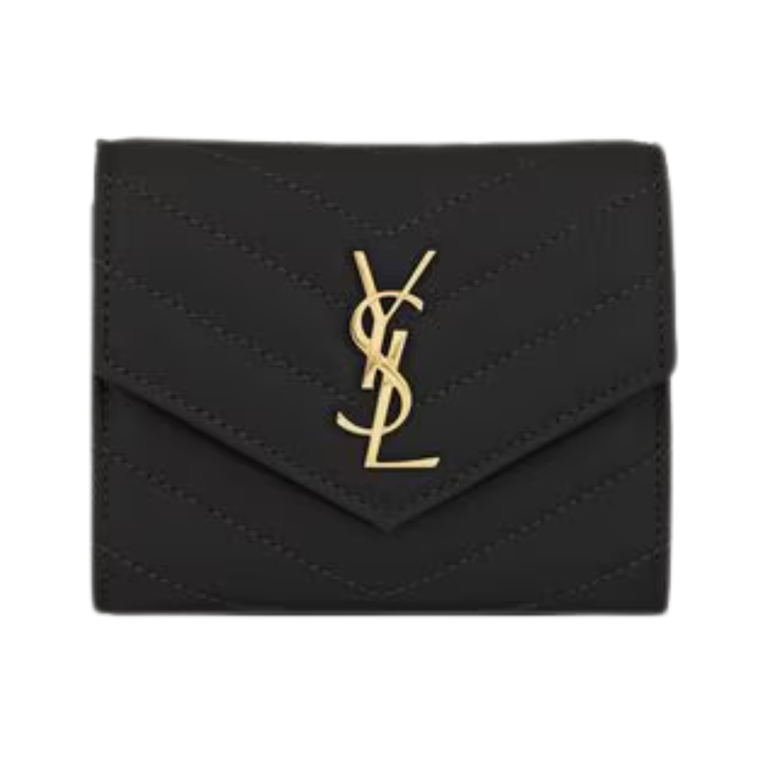 Portafoglio Saint Laurent Cassandre Matelassé Tri-Fold compatto in pelle Grain de Poudre nera 10.5 cm