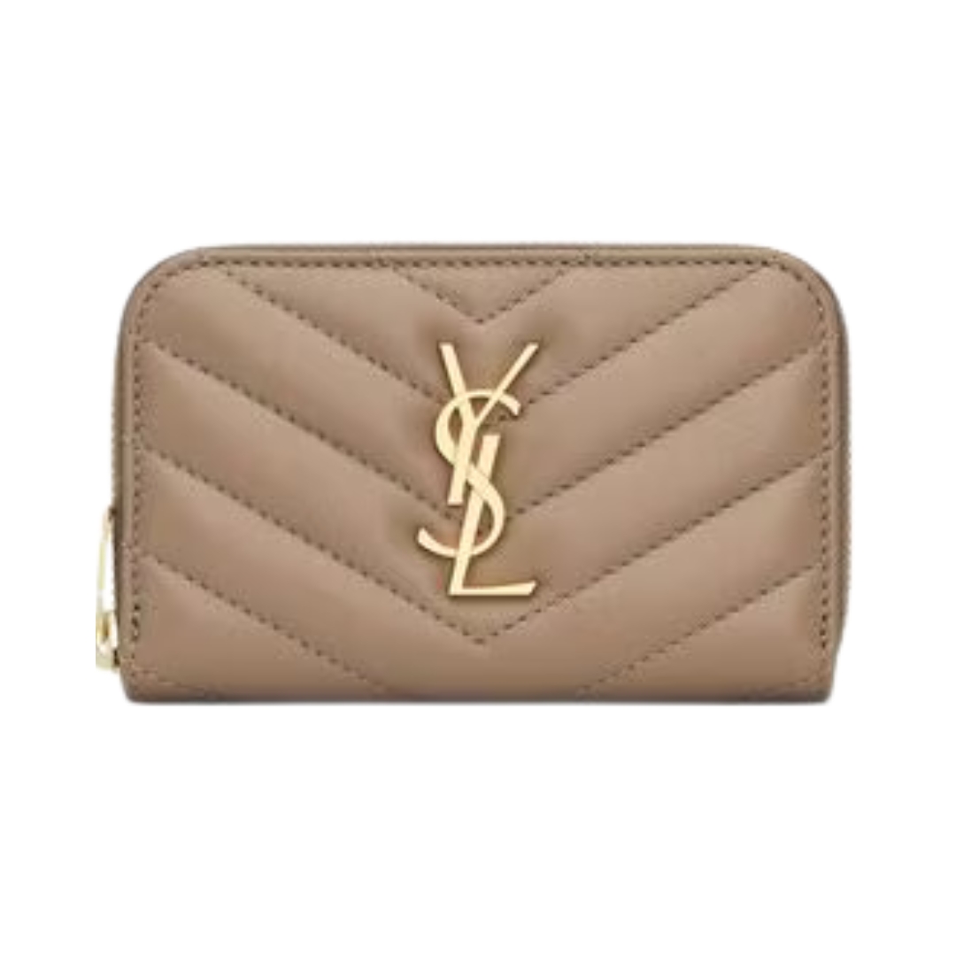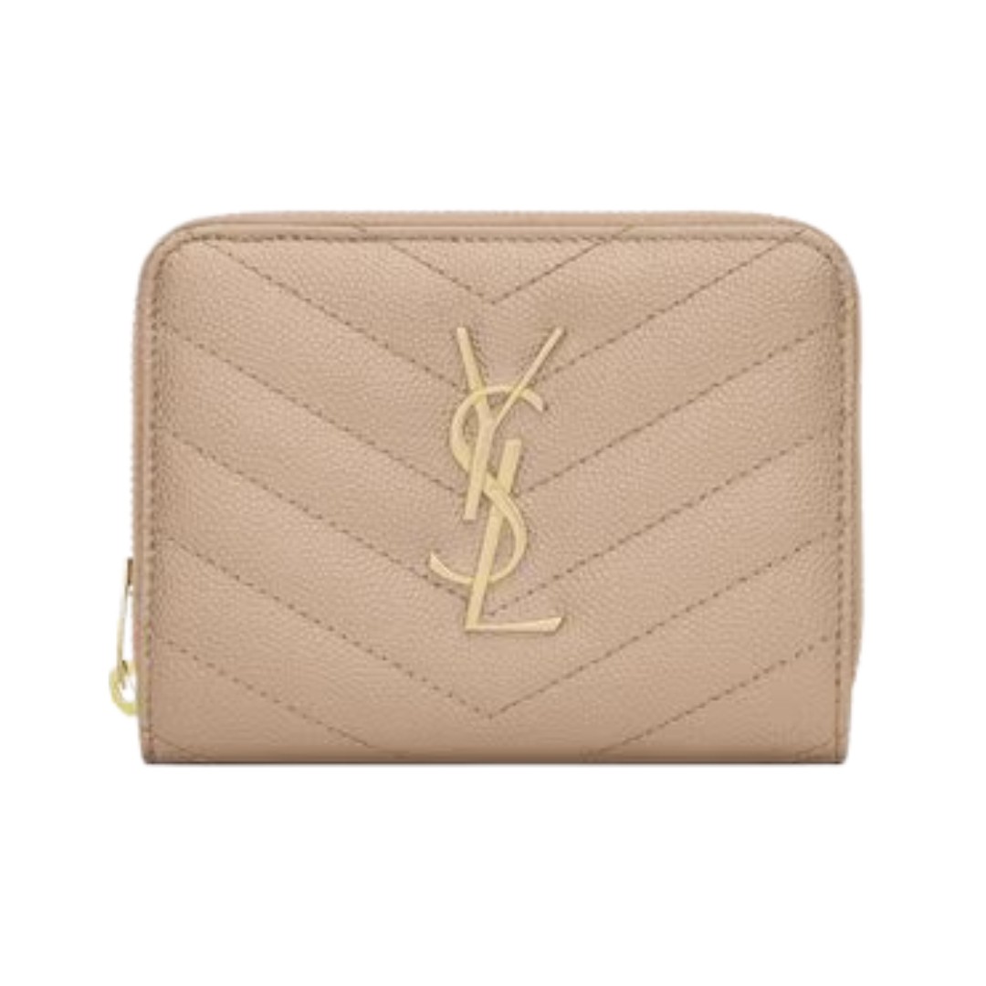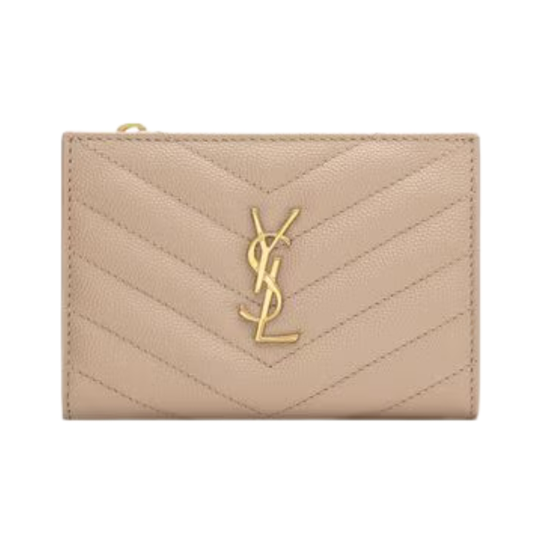 Dettagli:● Materiale: Pelle grain de poudre● Colore: Beige● Chiusura: Bottone a pressione● Logo: YSL dorato● Interno: Scomparti per carte e