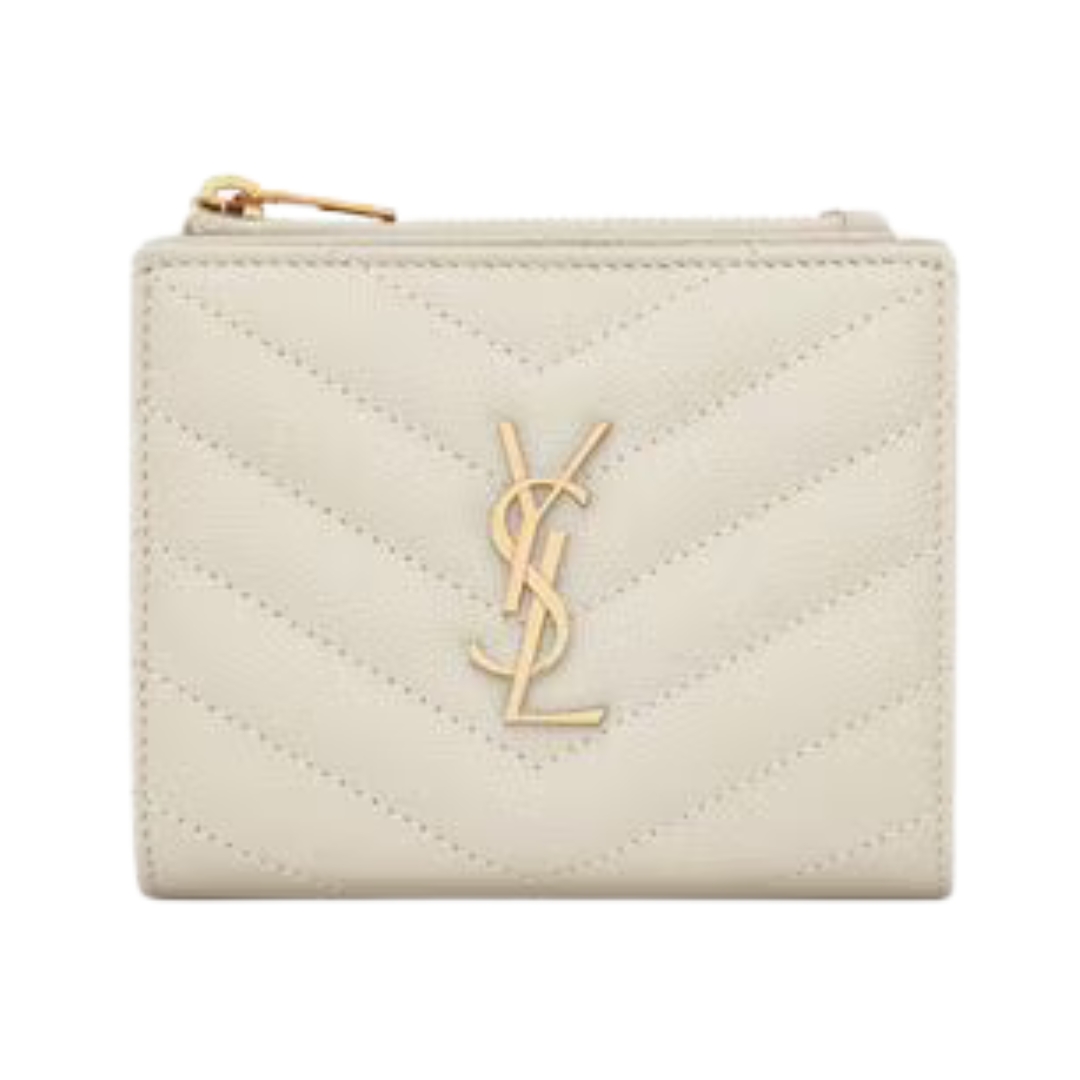 Dettagli:● Materiale: Pelle grain de poudre● Colore: Bianco● Chiusura: Bottone a pressione● Logo: Monogram YSL dorato● Interno: Organizzazione a più