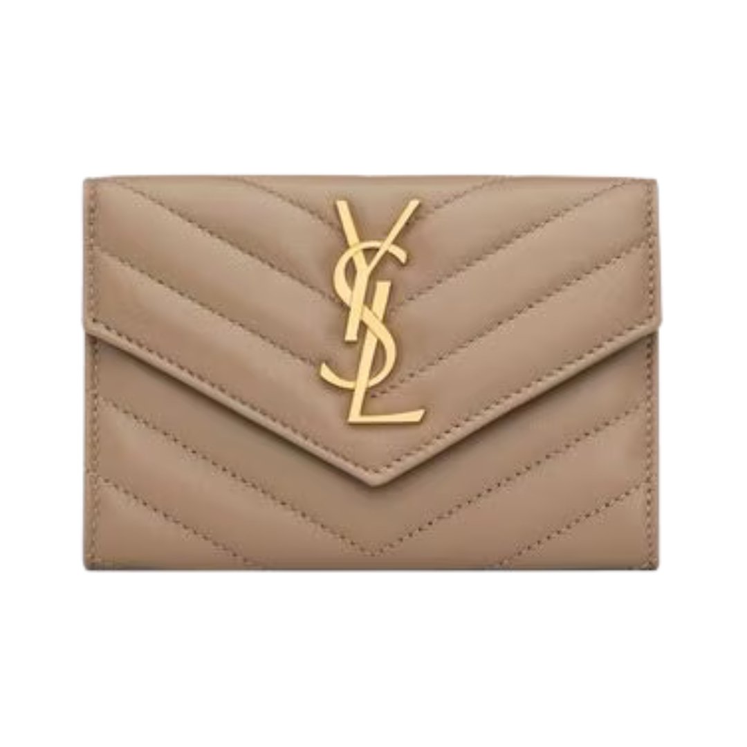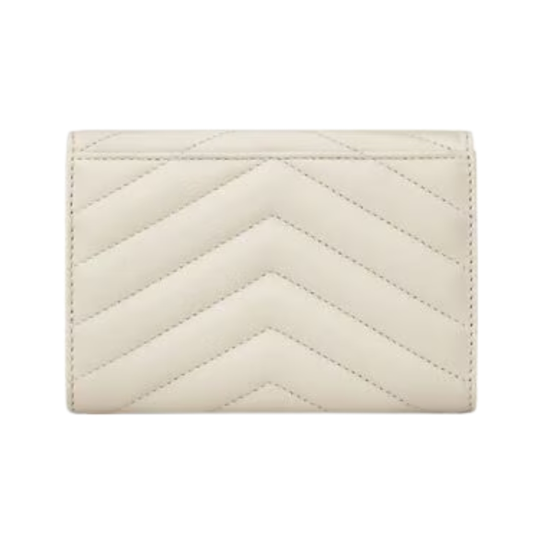 Portafoglio Saint Laurent Cassandre Matelassé Tri-Fold compatto in agnello avorio 12.5 cm