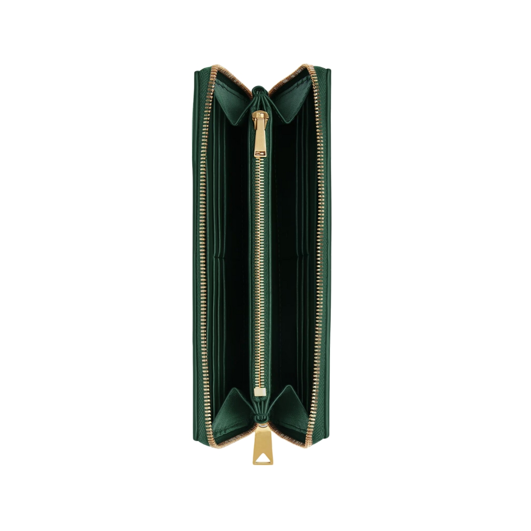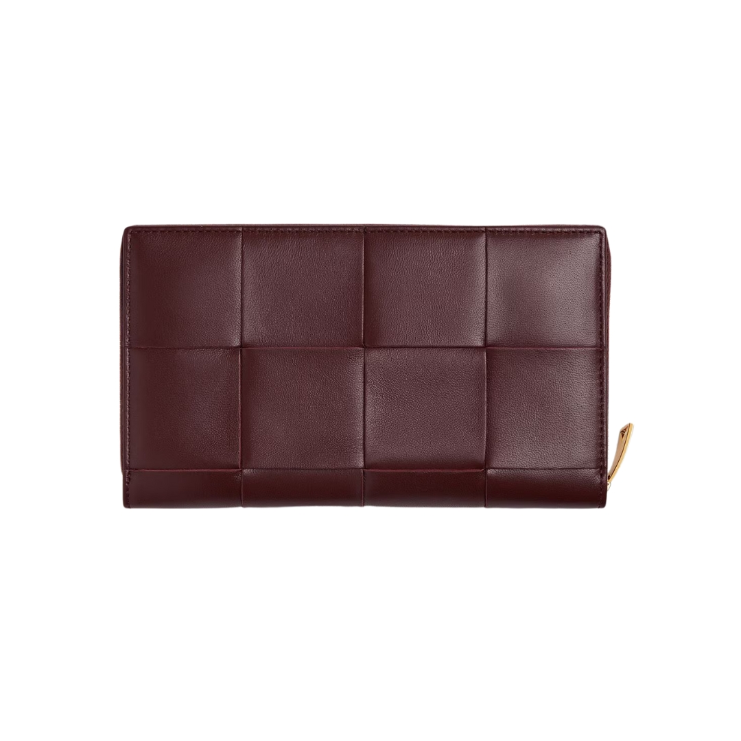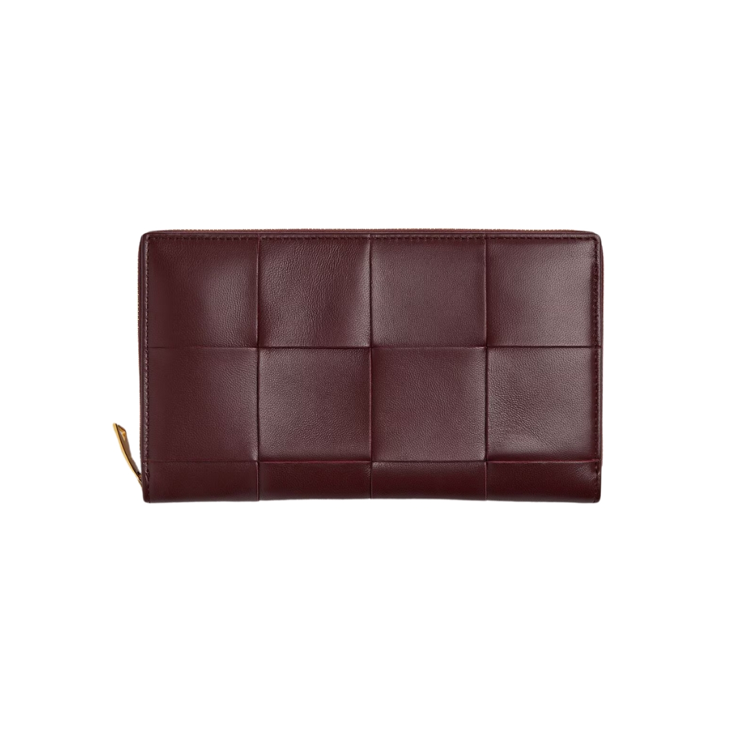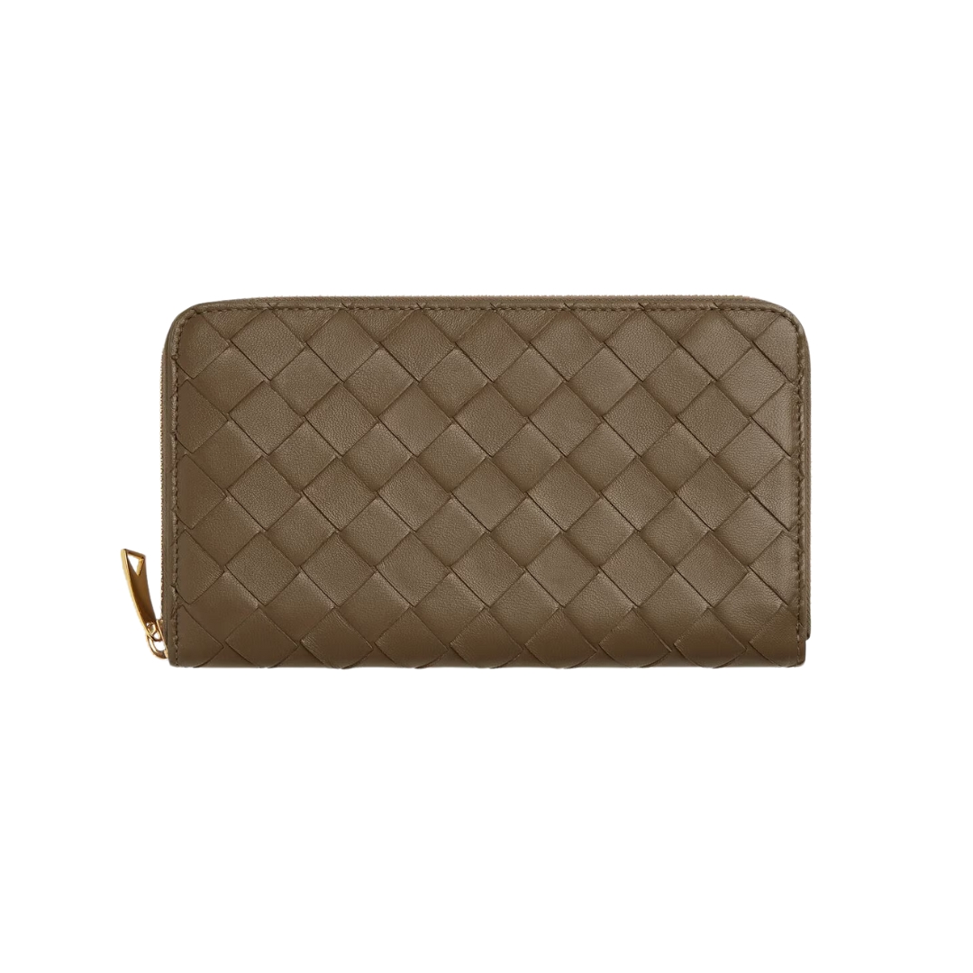 Dettagli:● Materiale: Pelle intrecciata● Colore: Marrone pigna● Chiusura: Zip● Logo: Interno inciso● Interno: Slot carte e banconote● Parti metalliche: Brunite●