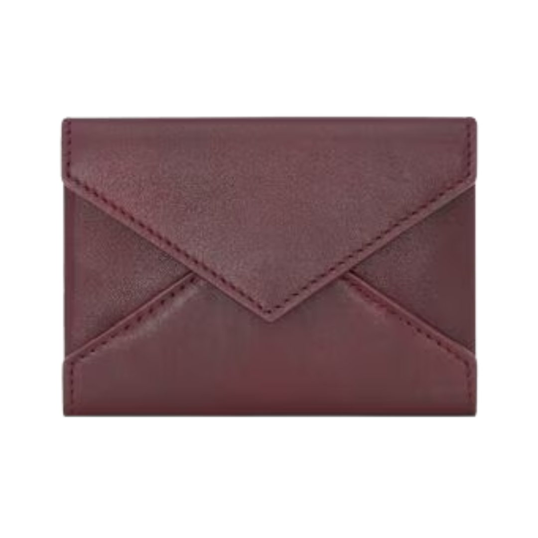 Dimensioni:● Larghezza: 10 cm● Altezza: 7 cm● Profondità: 2 cm Dettagli:● Materiale: pelle liscia● Colore: bordeaux● Chiusura: bottone a pressione●