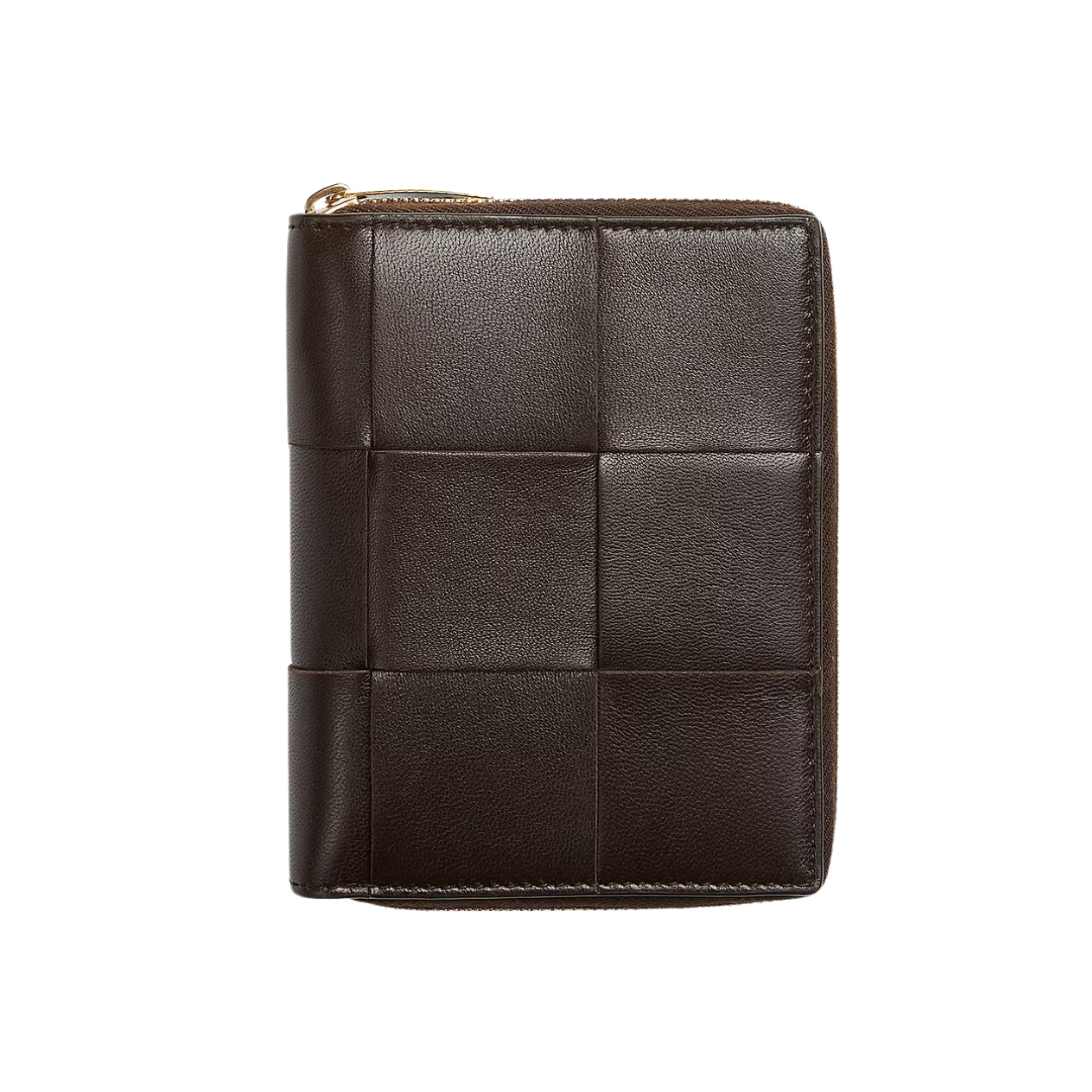 Dimensioni:● Larghezza: 9.5 cm● Altezza: 7.5 cm● Profondità: 2 cm Dettagli:● Materiale: Pelle intrecciata● Colore: Fondant (marrone scuro)● Chiusura: Patta