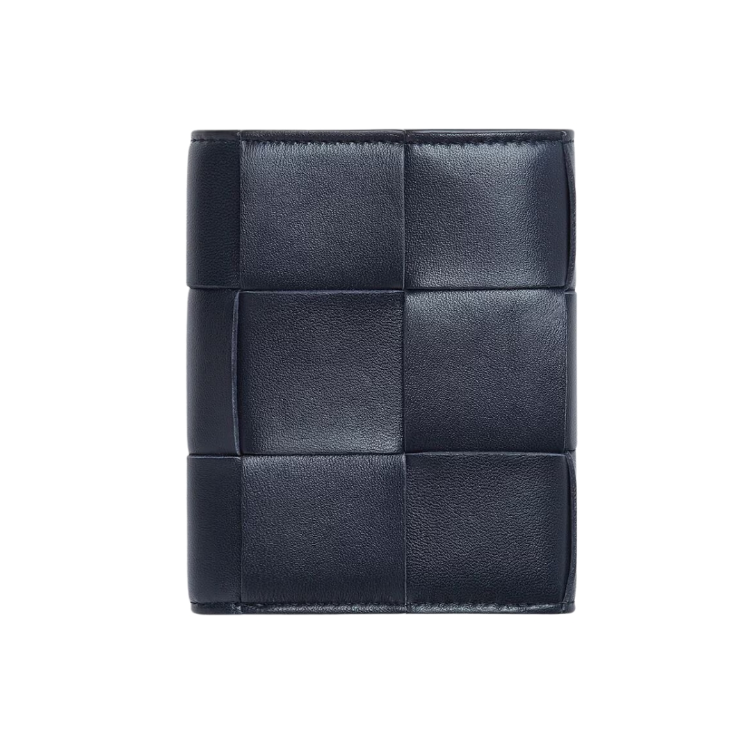 Dimensioni:● Larghezza: 9 cm● Altezza: 7.5 cm● Profondità: 2 cm Dettagli:● Materiale: pelle di vitello intrecciata● Colore: blu Space● Chiusura: