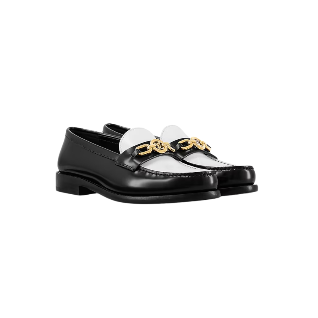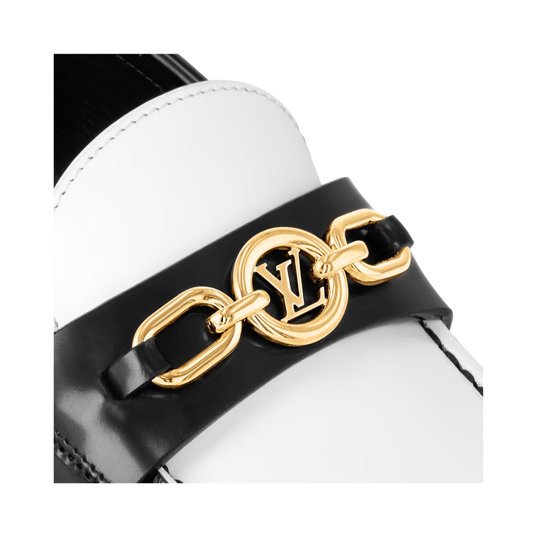 Dettagli:● Materiale: Pelle di vitello● Colore: Nero e bianco● Chiusura: Slip-on● Logo: Catena LV dorata● Suola: Pelle● Interno: Pelle● Parti