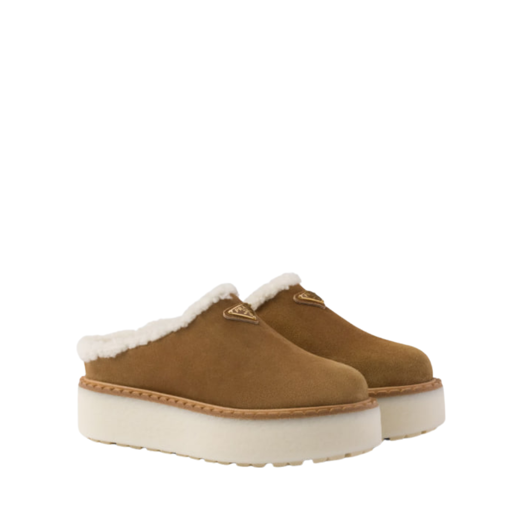 Sabot Prada in camoscio marrone con shearling