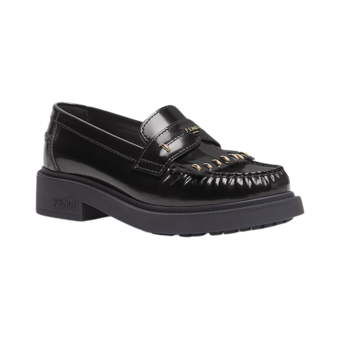 Dettagli:● Materiale: Pelle di vitello lucida● Colore: Nero● Chiusura: Senza chiusura (slip-on)● Logo: Logo FF dorato sulla mascherina● Suola: In