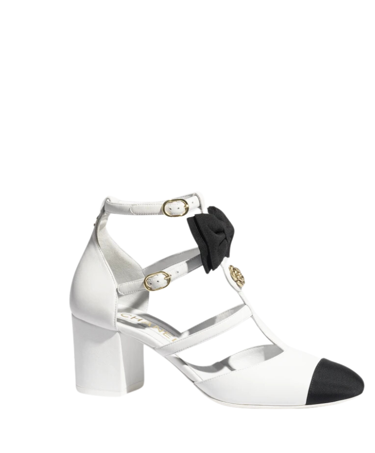 Dettagli:● Materiale: Pelle verniciata● Colore: Bianco con punta nera● Chiusura: Cinturini multipli con bottoni dorati● Logo: Logo CC inciso su