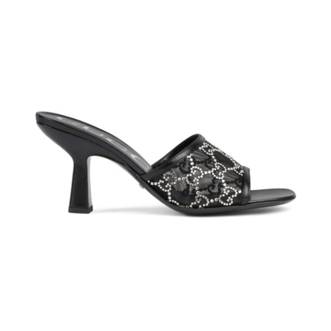 Mules Gucci neri in mesh con logo GG in cristalli e tacco 7,5 cm