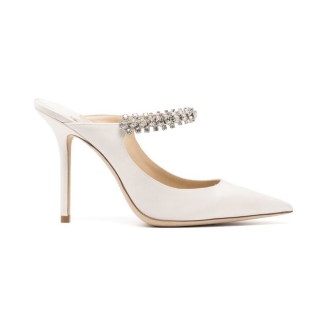 Mules Jimmy Choo Bing in raso bianco con cinturino gioiello 10 cm