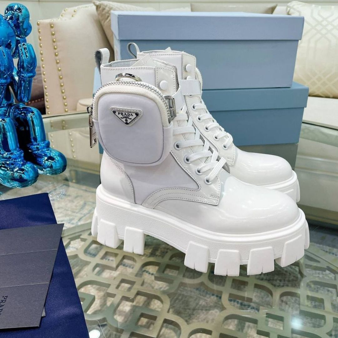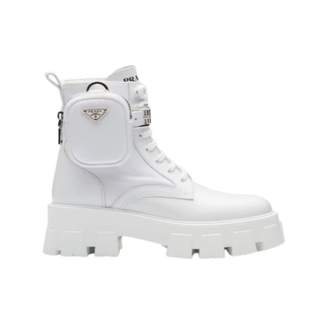 Dettagli:● Materiale: Pelle liscia● Colore: Bianco● Chiusura: Lacci e zip laterale● Logo: Triangolo Prada in rilievo● Suola: Carrarmato in gomma●
