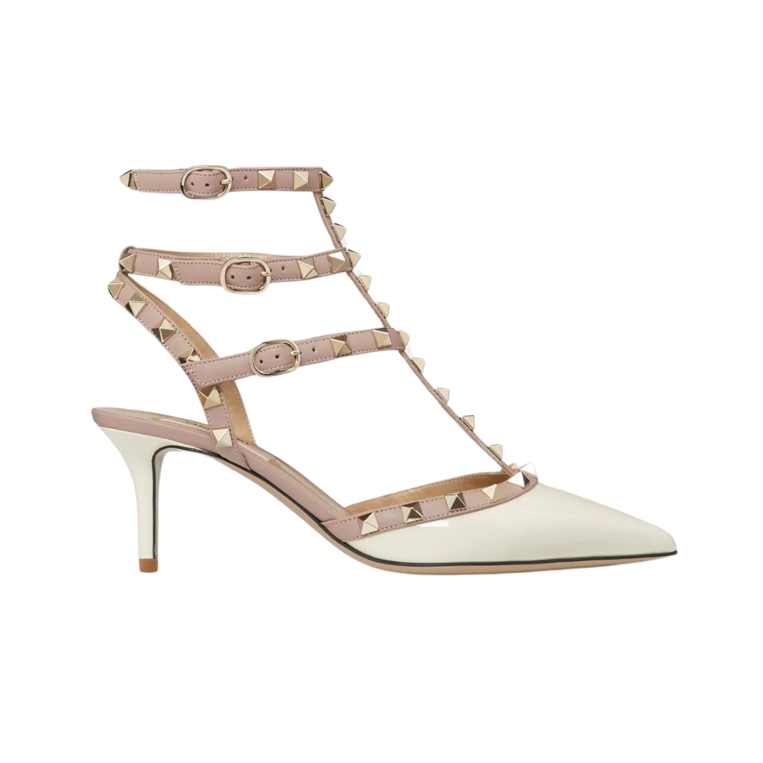 Décolleté Valentino Rockstud cage in pelle avorio e cinturini rosa cipria, tacco 6,5 cm