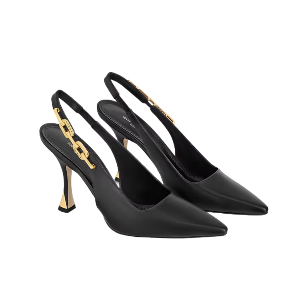 Dettagli:● Materiale: Pelle di vitello● Colore: Nero● Chiusura: Cinturino posteriore● Logo: Fibbie LV dorate● Suola: Pelle● Interno: Pelle● Parti metalliche: