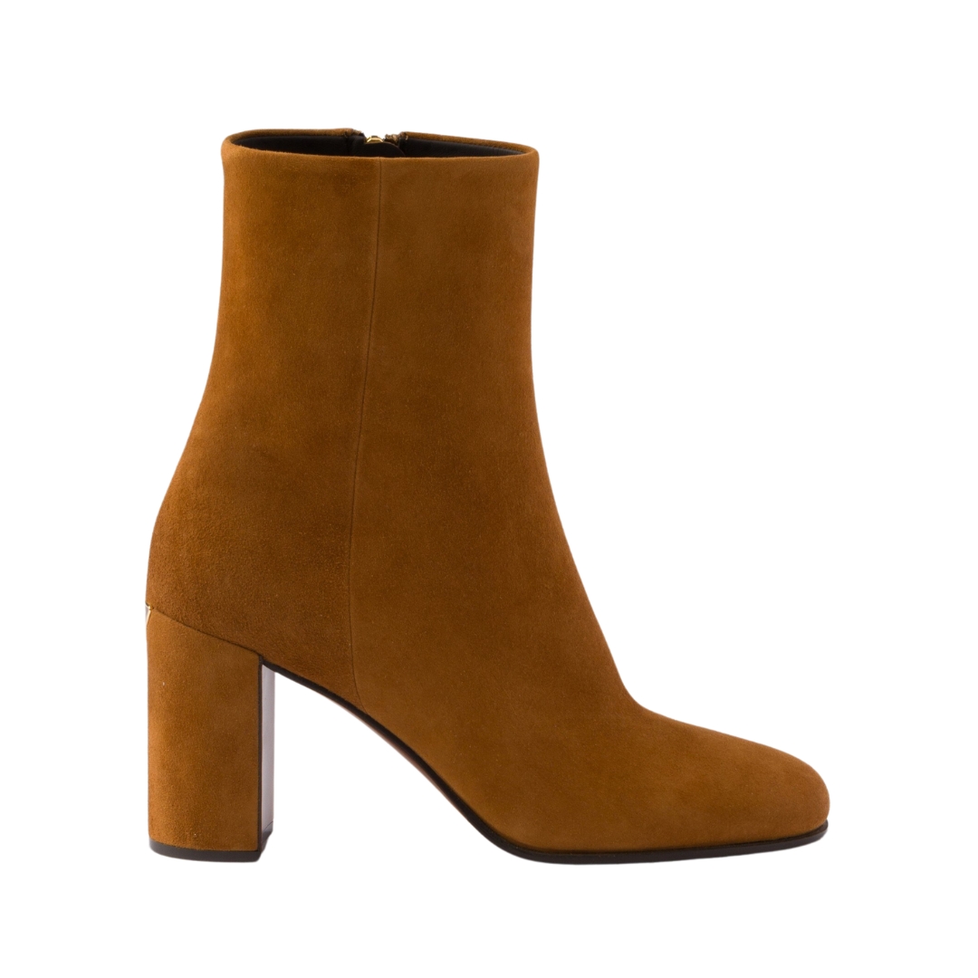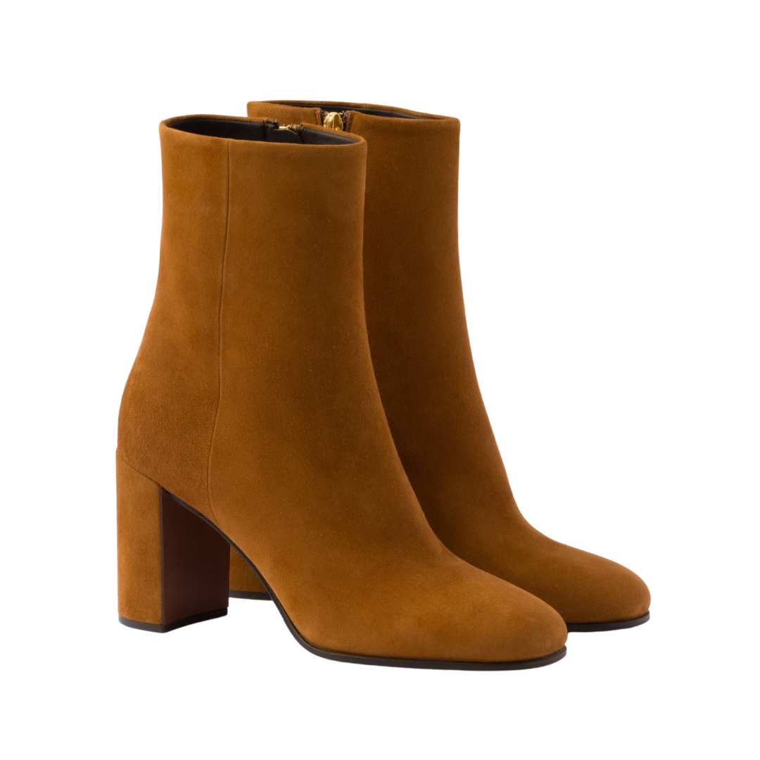 Stivaletti Prada in camoscio cognac con tacco 8.5 cm