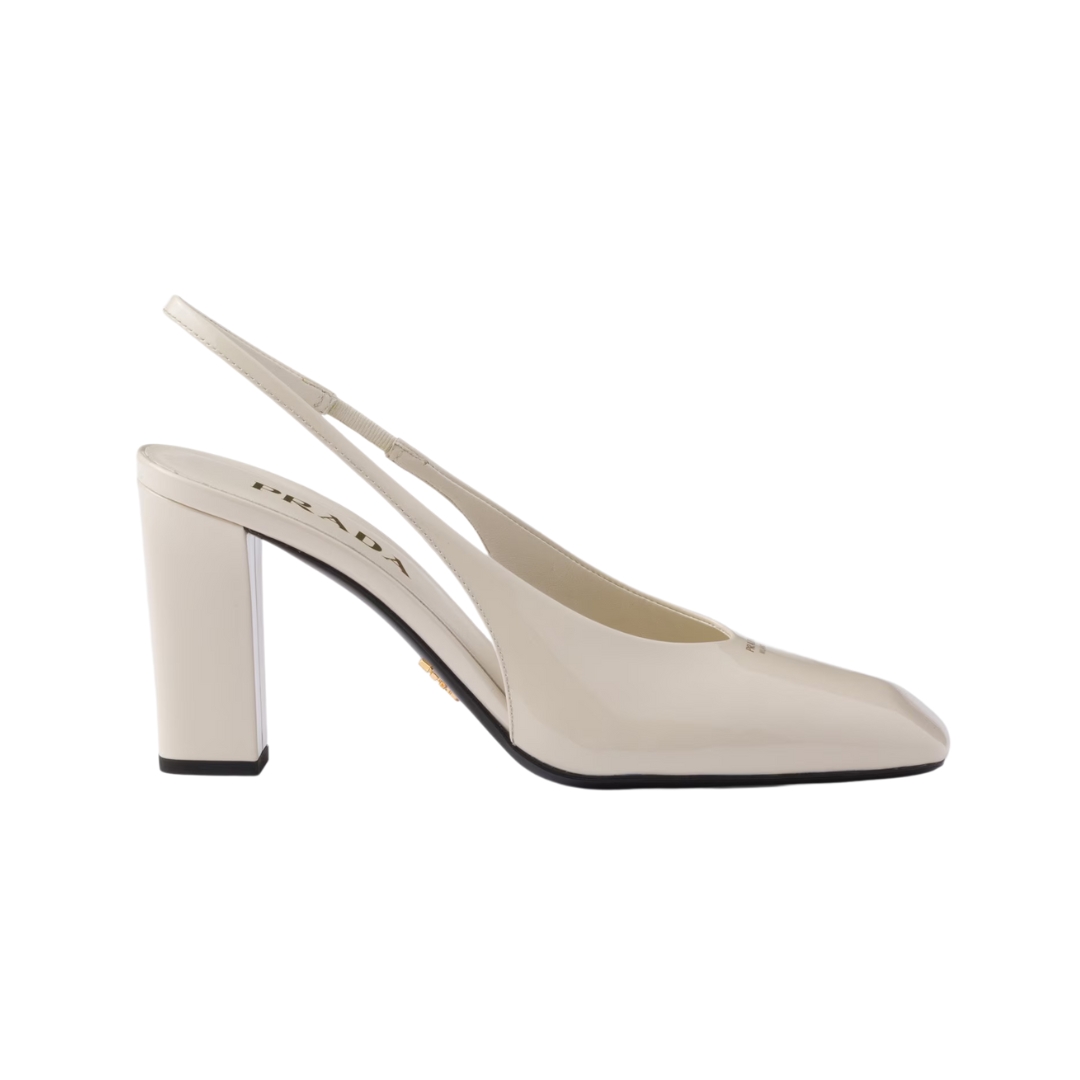Décolleté slingback Prada in vernice avorio con tacco 8.5 cm