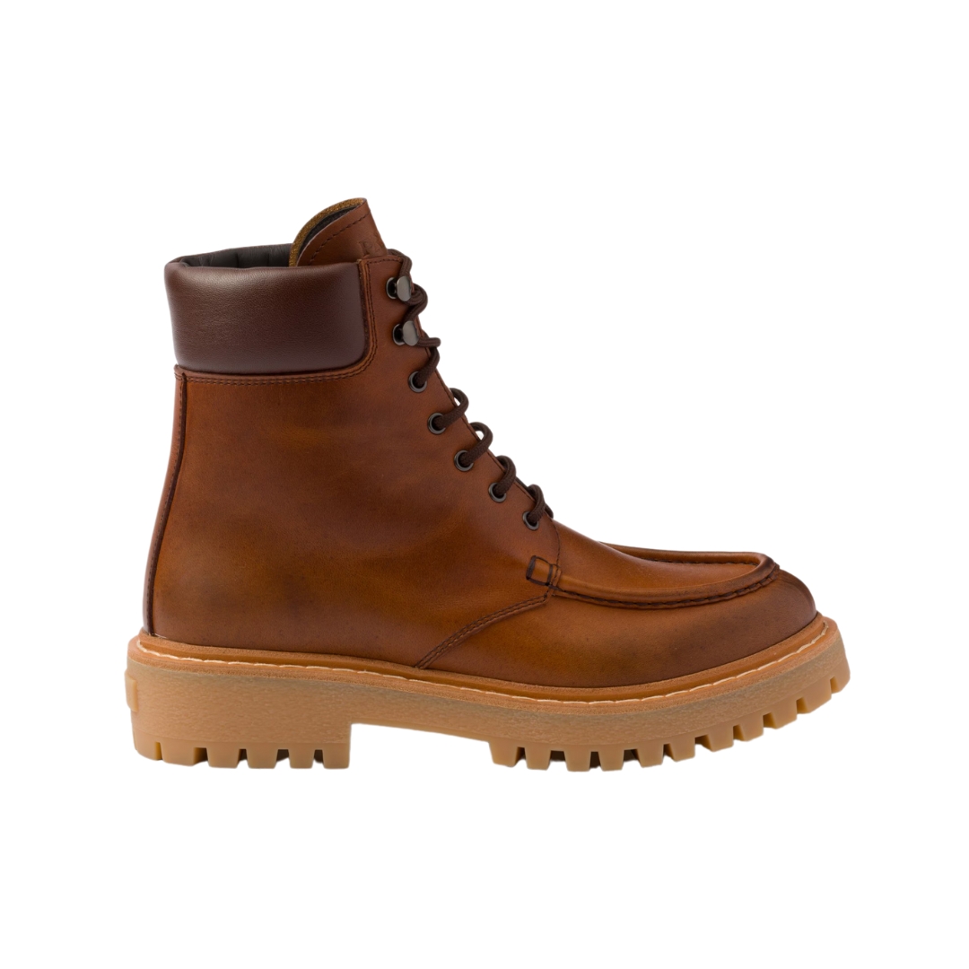 Dettagli:● Materiale: Pelle liscia● Colore: Cognac● Chiusura: Lacci con occhielli metallici● Logo: Triangolo Prada laterale in rilievo● Suola: Carrarmato in