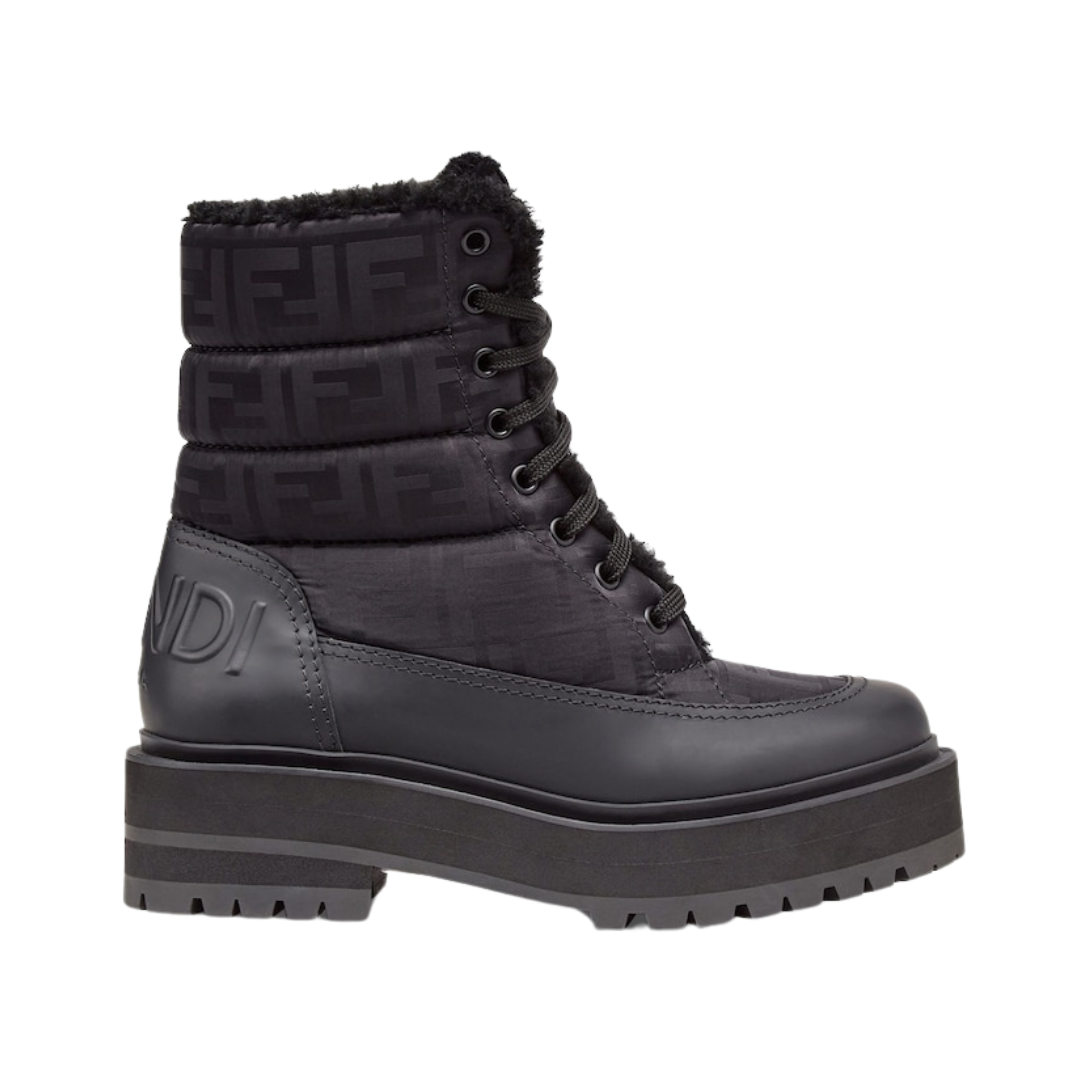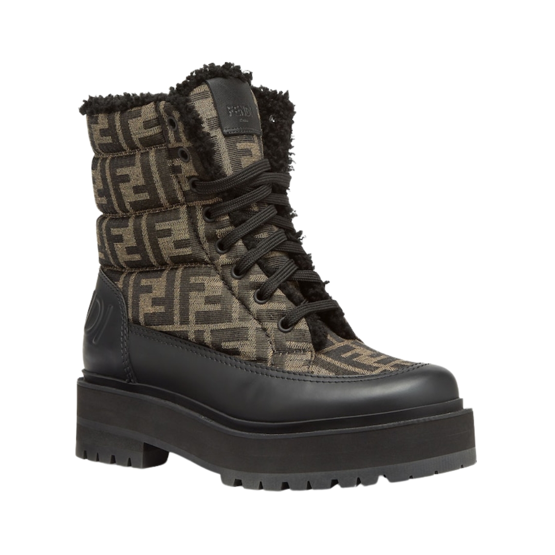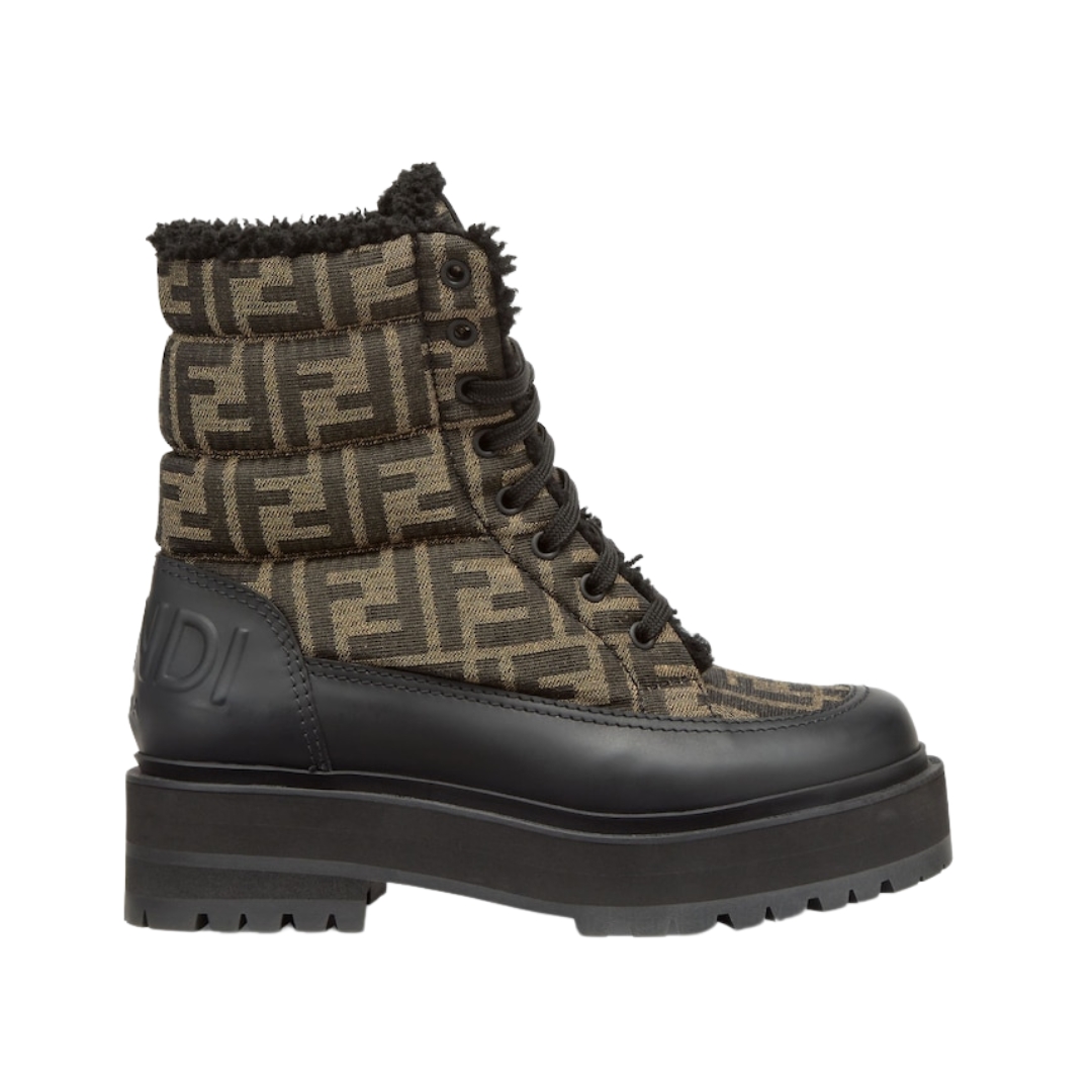 Dettagli:● Materiale: Pelle di vitello e tessuto jacquard FF● Colore: Nero e marrone● Chiusura: Lacci frontali● Logo: Motivo FF in