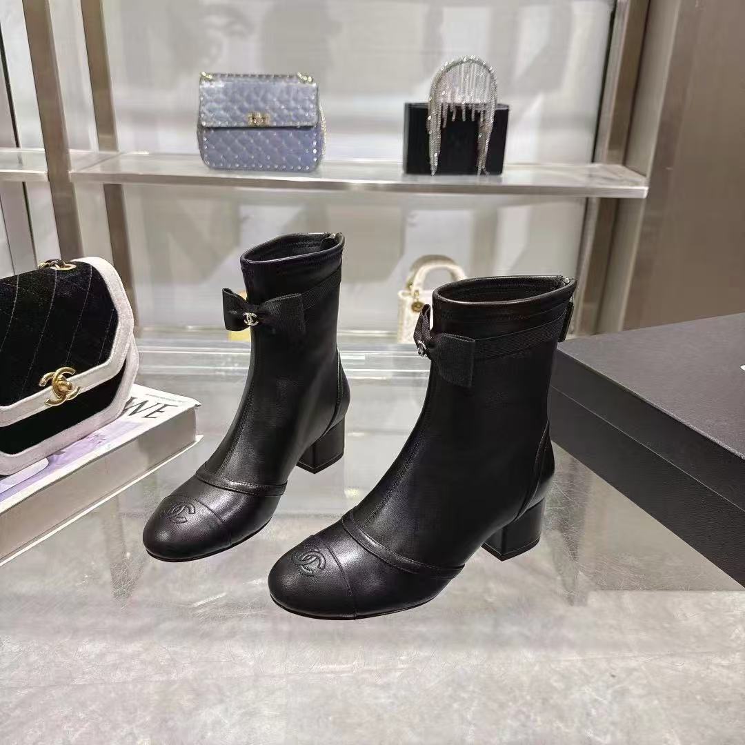 Stivaletti Chanel in pelle nera con fiocco e logo CC