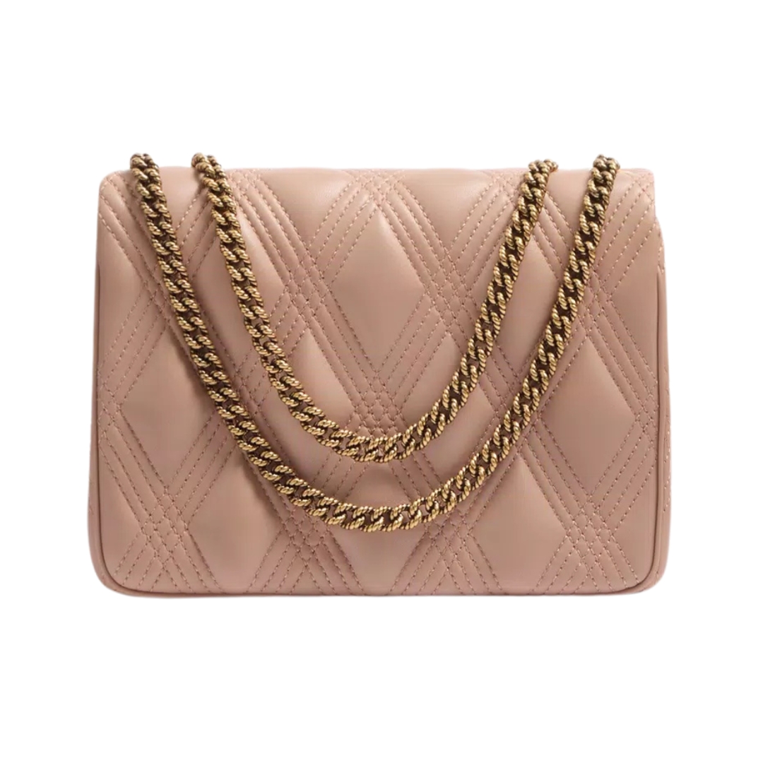 Dimensioni:● Larghezza: 23 cm● Altezza: 15 cm● Profondità: 7 cm Dettagli:● Materiale: Nappa trapuntata● Colore: Rosa cipria● Chiusura: Patta con