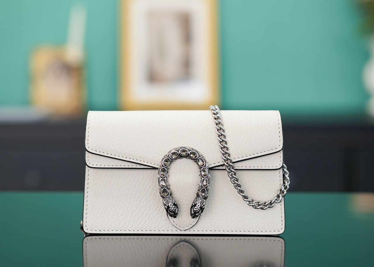 Borsa Gucci Dionysus Super Mini in pelle martellata avorio 16,5 cm