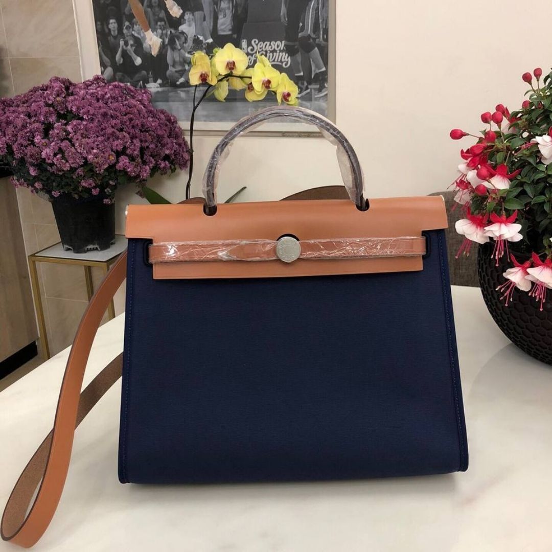 Borsa Hermès Herbag in tela blu e pelle arancione 31 cm