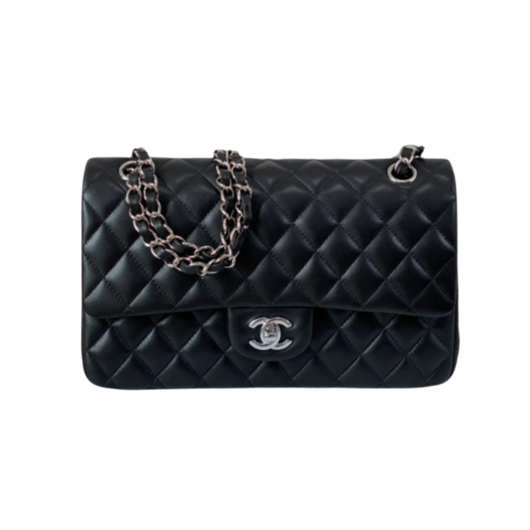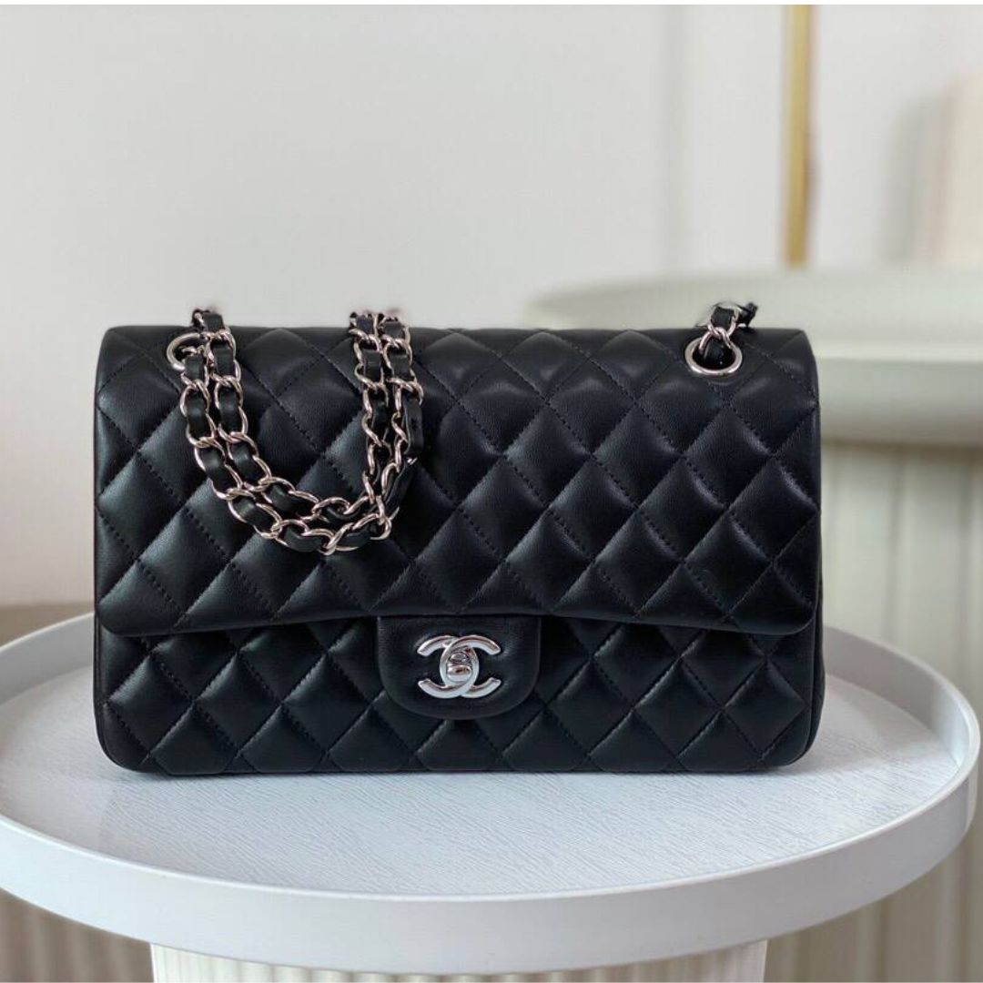 Borsa Chanel Classic Flap in pelle liscia nera con finiture argento 25,5 cm