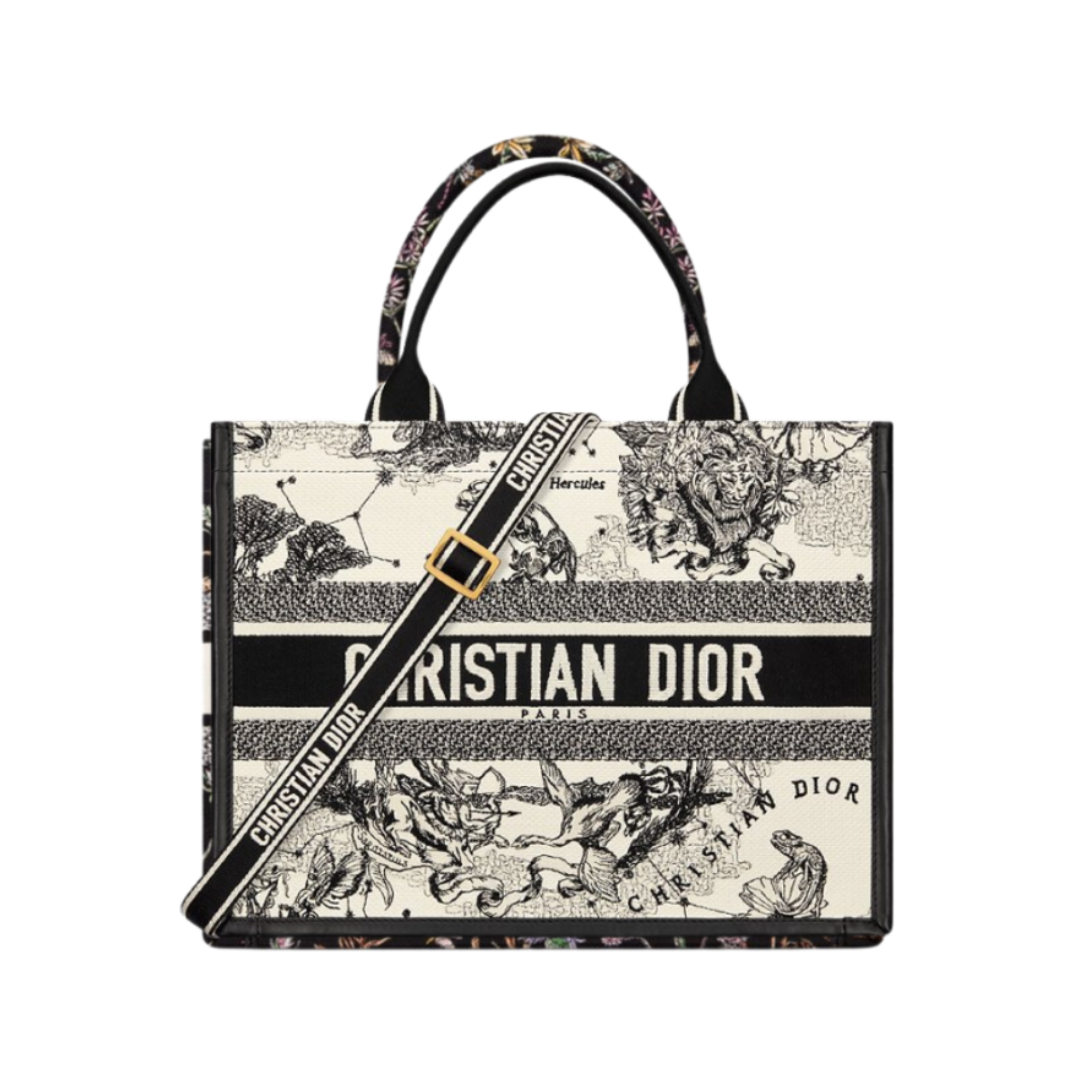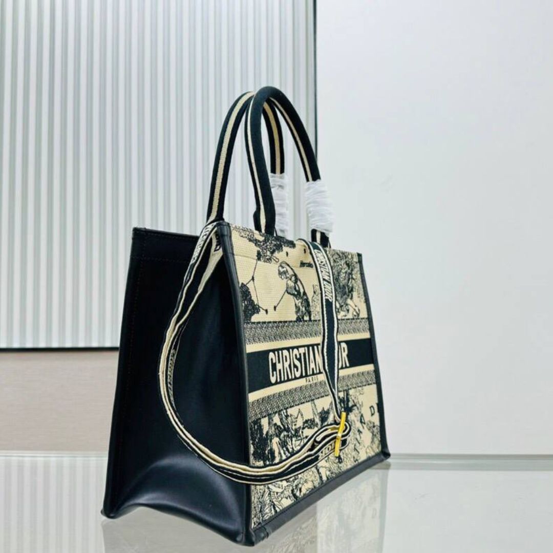 Borsa Dior Book Tote media Toile de Jouy Sauvage nero e avorio 36 cm
