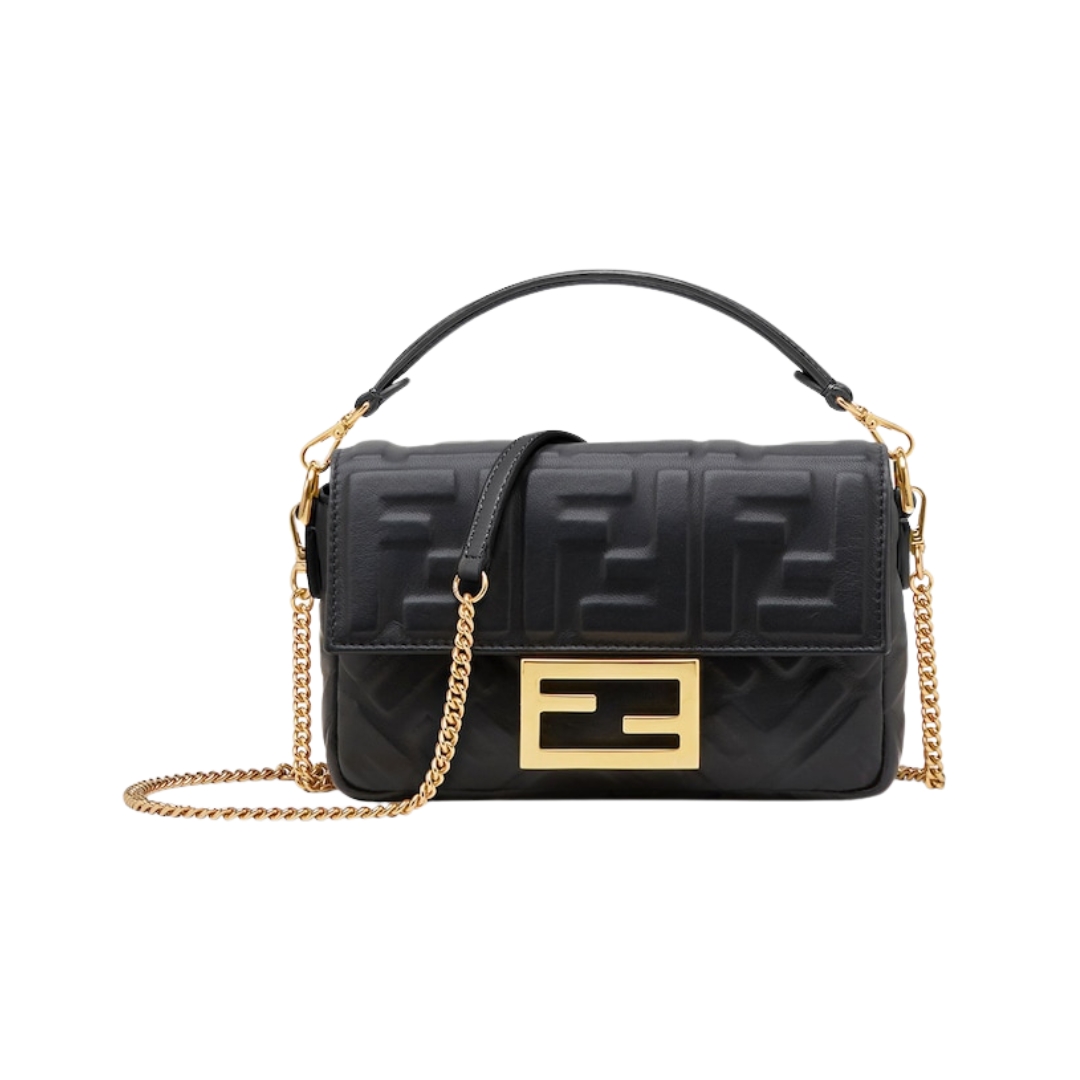Borsa Fendi Baguette Chain Mini in pelle nappa nera con motivo FF 13 cm