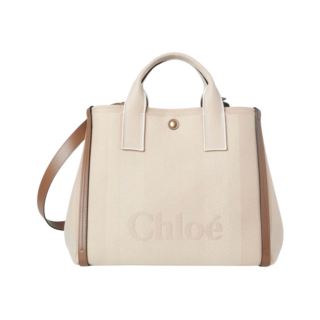 Borsa shopper piccola Chloé Woody in tela beige e pelle 26 cm