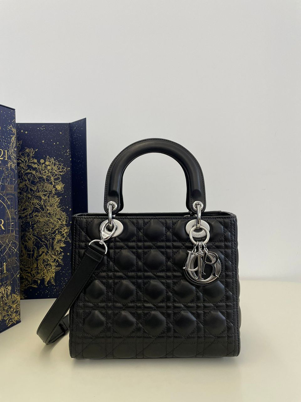 Borsa Dior Lady in pelle nera con dettagli argento 24 cm