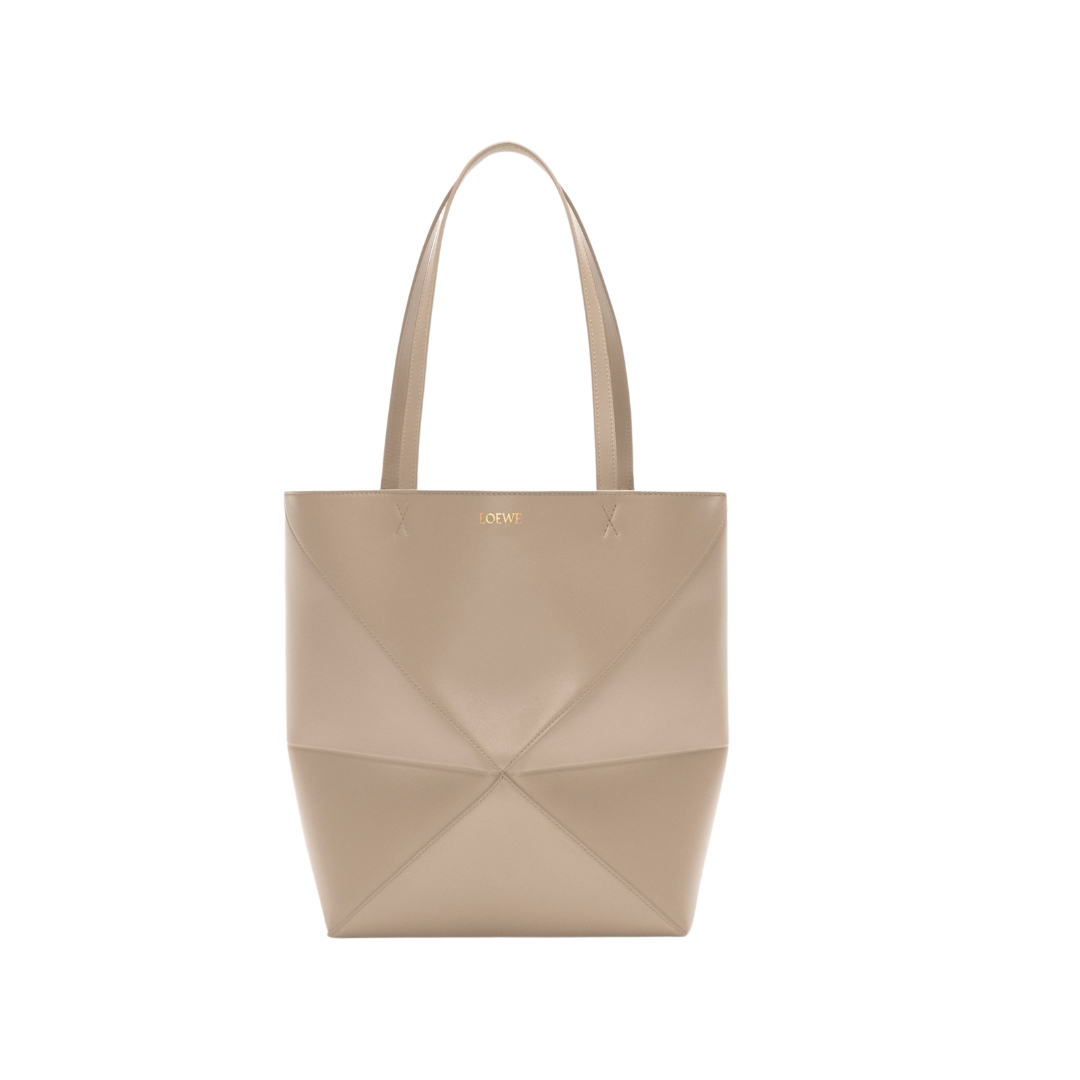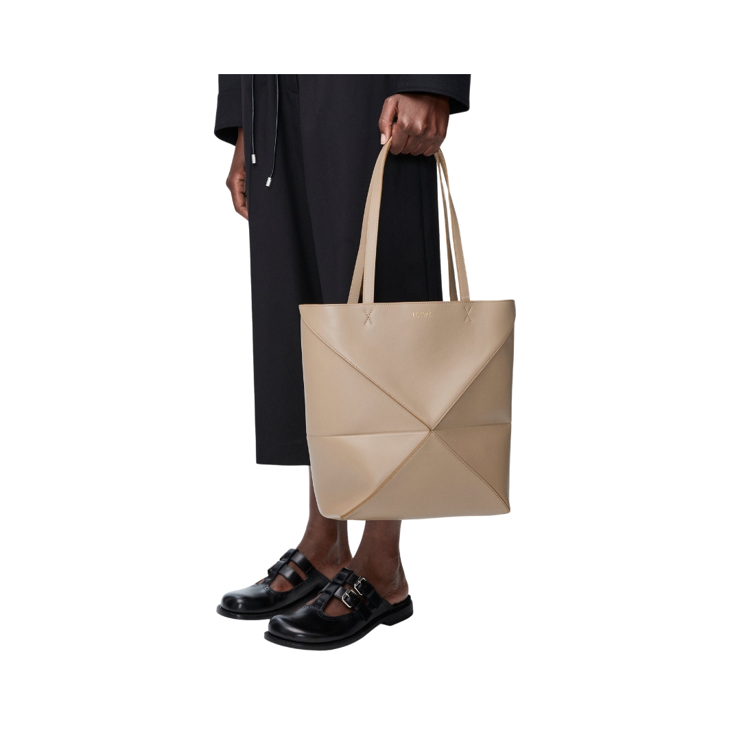 Borsa Puzzle Fold media in pelle lucida beige sabbia 31,5 cm