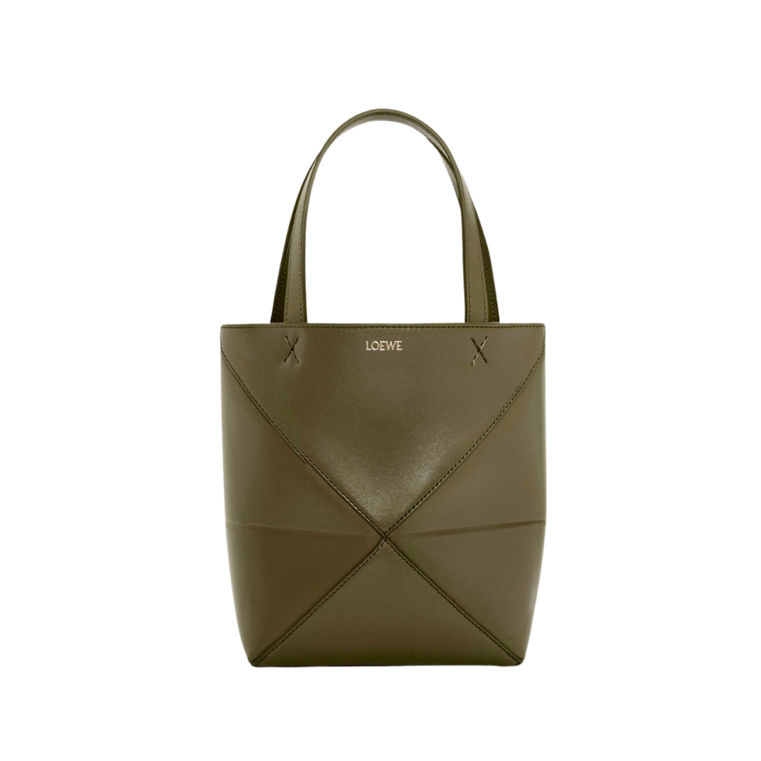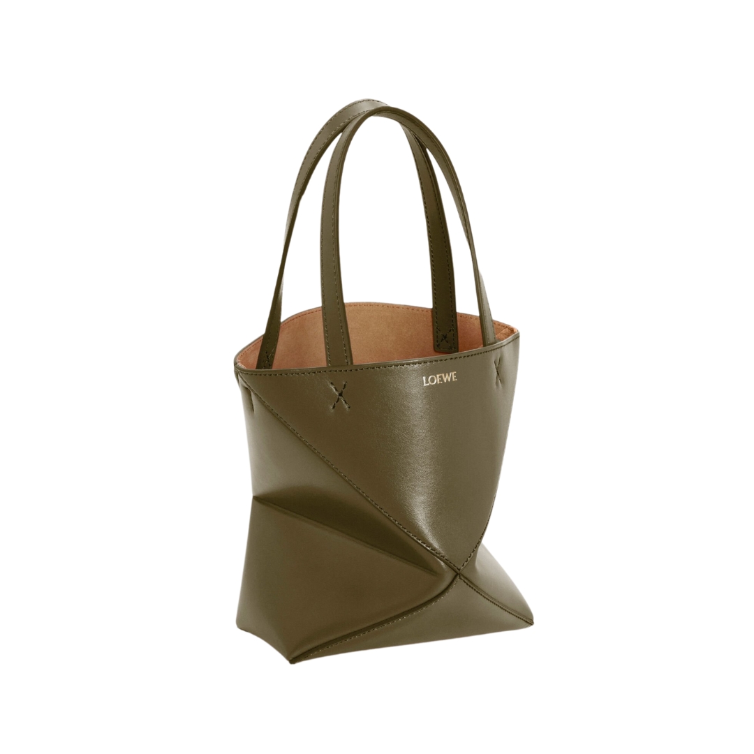Borsa Loewe Mini Puzzle Fold Tote in pelle verde kaki scuro 20 cm